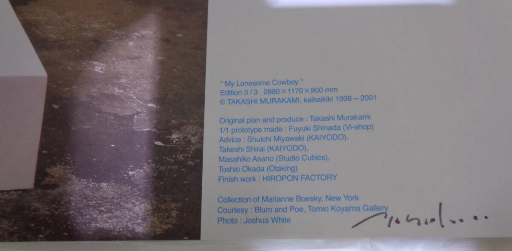 “My Lonesome Cowboy” is one of Murakami’s most important and culturally disruptive works—a playful yet confrontational commentary on sexuality, fandom, and the aesthetics of otaku culture. This 500×500mm offset print was released as an edition of 300, capturing the sculpture exhibited during Murakami’s influential global Superflat expansion.