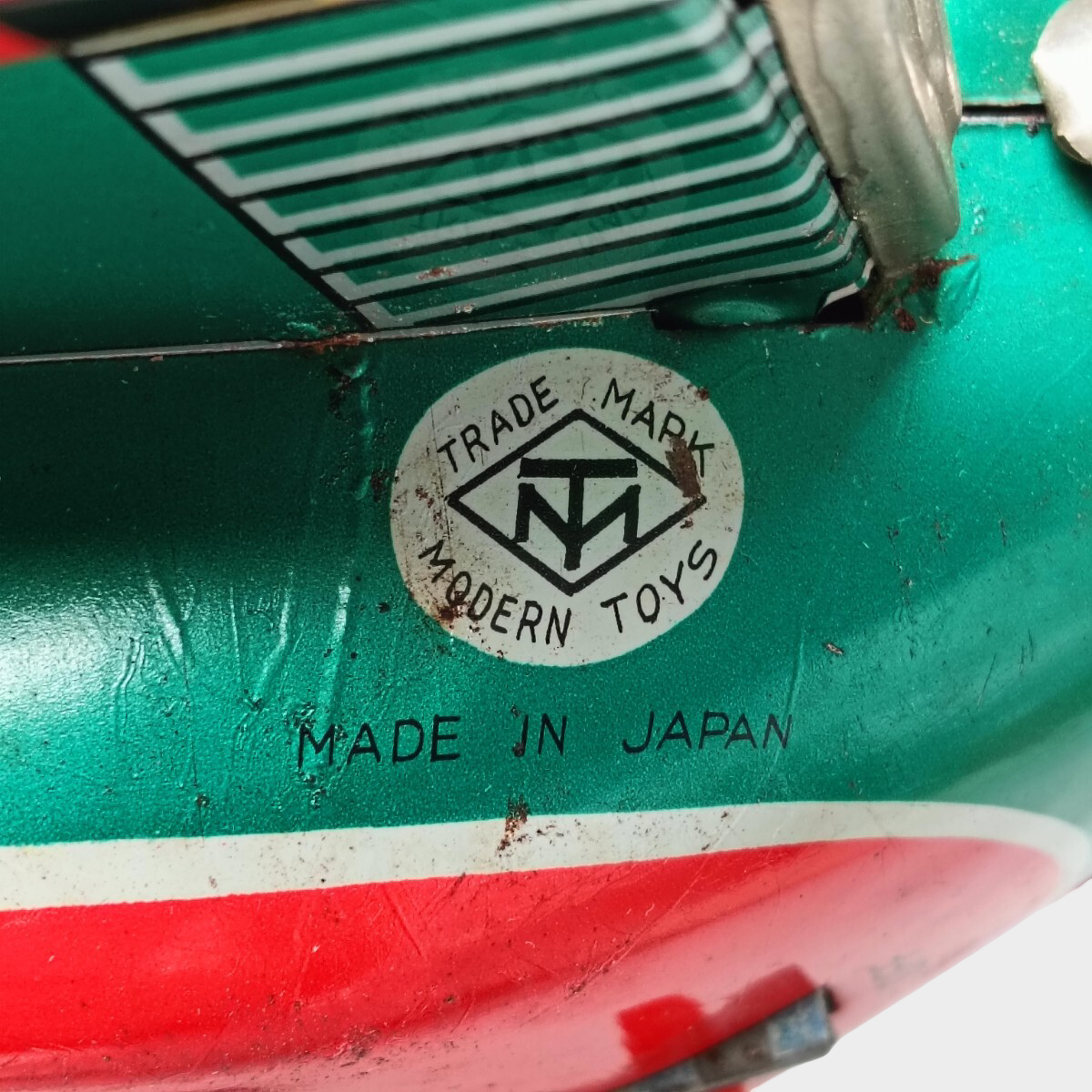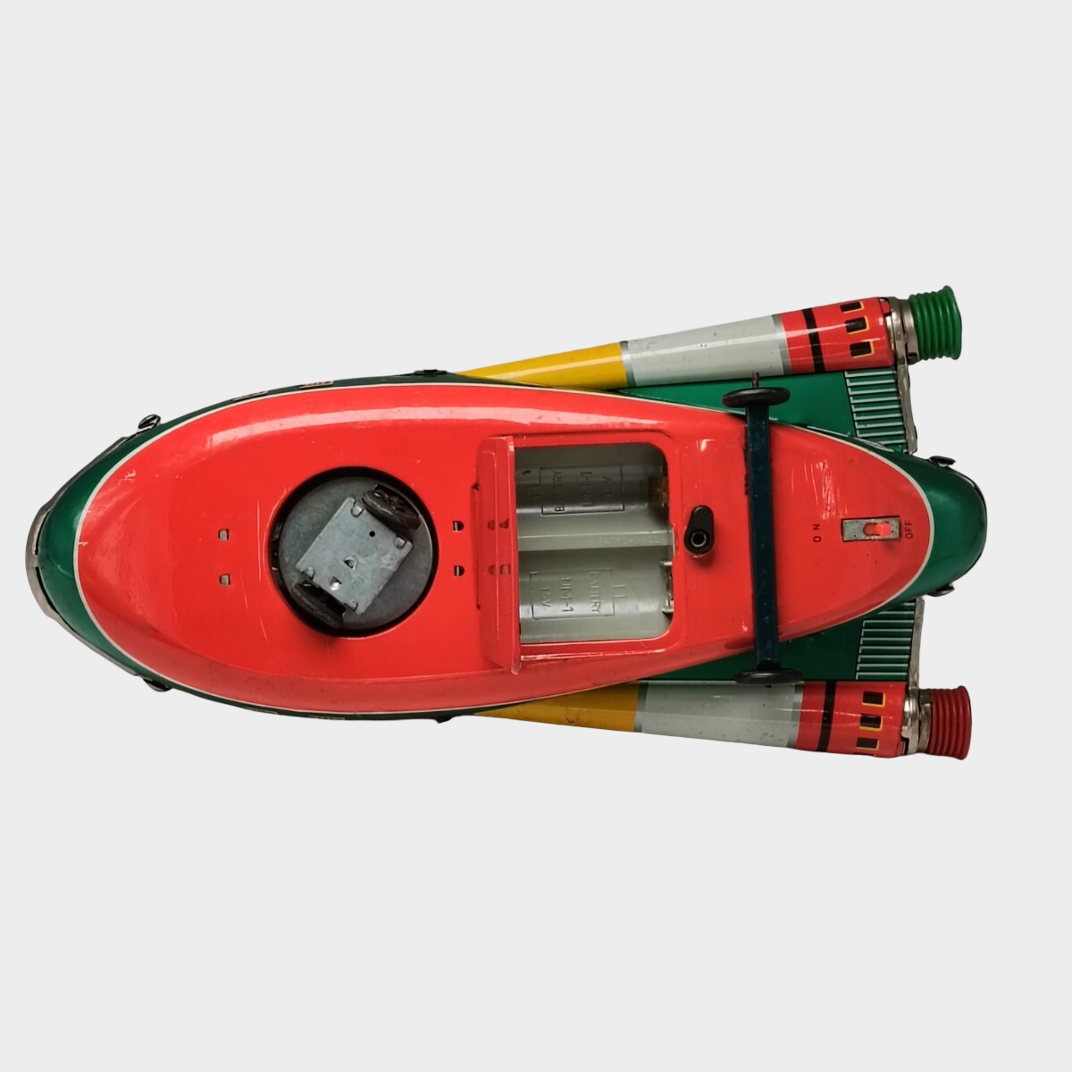 Constructed from printed tinplate and driven by an internal electric (battery) motor, the Firebird belongs to a more advanced tier of tin toys. Battery operation required tighter tolerances, higher production costs, and more complex assembly than friction toys, positioning this piece as a premium play object at the time of manufacture.
