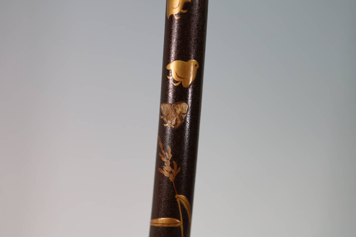 A period Japanese tachi display stand in lacquer with gold maki-e floral ornament over a pear-skin ground, created to support a tachi worn edge-down in formal presentation. The decorative field balances geometric cadence with seasonal florals—peony, tachibana citrus, water narcissus, and plum—expressing prosperity, refinement, and renewal.