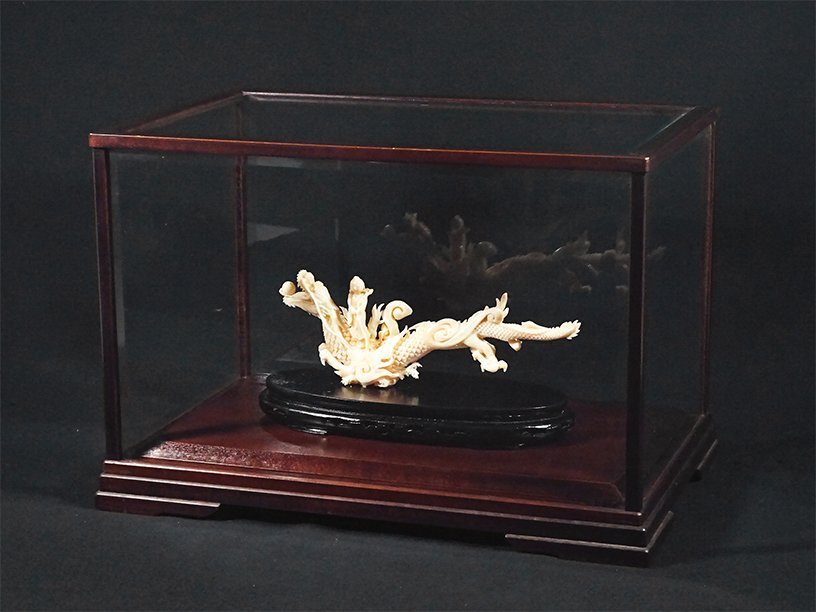 Finely carved natural coral sculpture depicting a Dragon Immortal, presented with wooden base and glass display case.