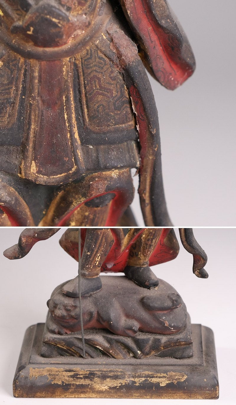 Carved in wood and finished with polychrome and gilt accents, the sculpture shows honest age: softened edges, areas of pigment loss, and the kind of surface history collectors prefer because it confirms lived time rather than modern imitation. As an object, it belongs equally to the world of devotional art and to the collector’s cabinet — a compact monument with temple lineage in its visual language.