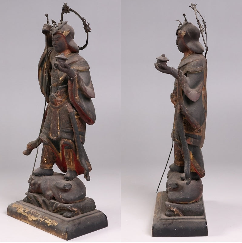 Bishamonten is a protector deity associated with safeguarding, victory, and prosperous fortune. In Japanese Buddhist iconography, he is counted among the Shitenno (Four Heavenly Kings), guardians of the Dharma. Collectors often seek Bishamonten for his unmistakable “guardian energy” — a presence that reads instantly in a space without relying on ornament or sentimentality.