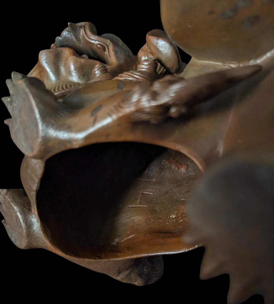 Condition: described as an older item with age-related wear; tail-area repair is noted by the seller. Review photos carefully and confirm stability before functional incense use.