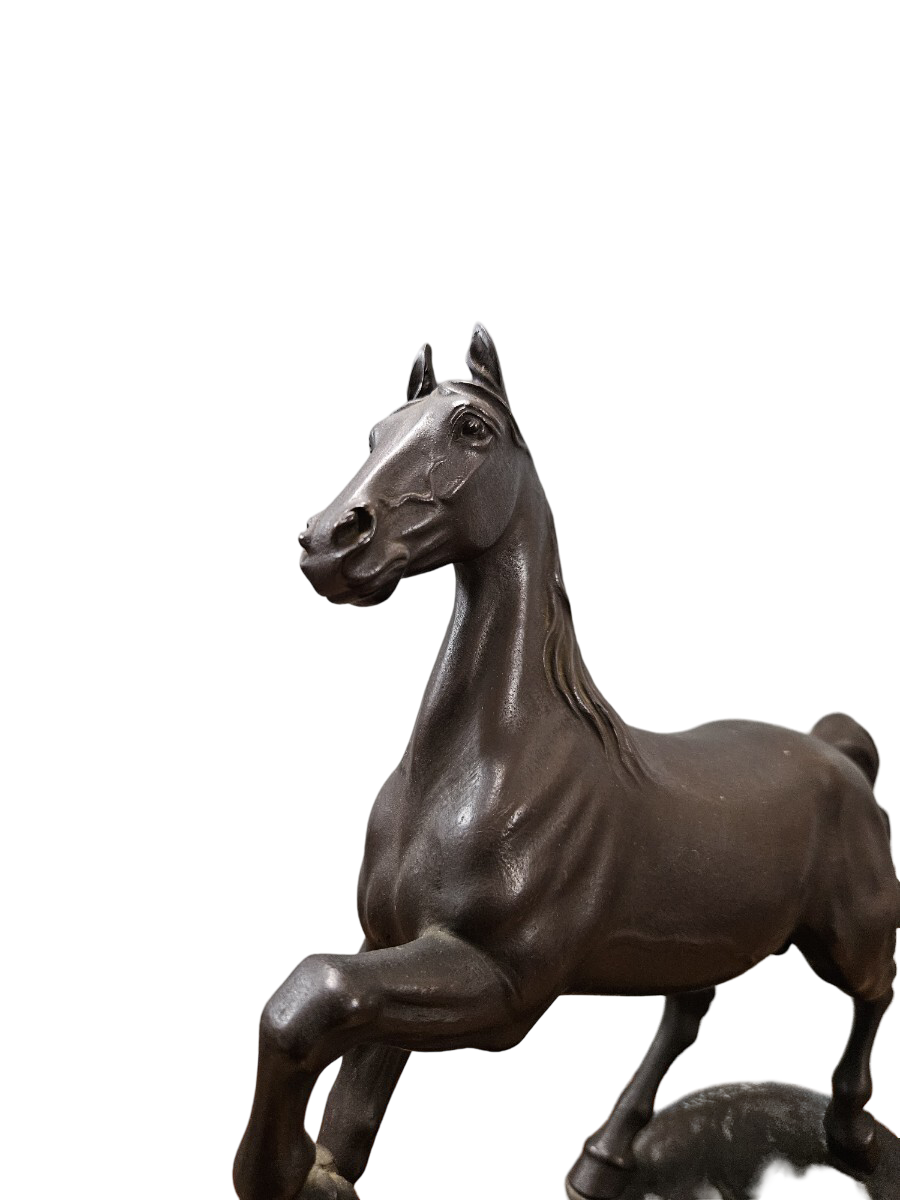 During this period, Japanese bronze artists increasingly studied Western anatomy and naturalistic proportion while retaining an indigenous sensitivity to rhythm and surface. This work reflects that synthesis. The mane is simplified yet directional, the neck elongated with quiet strength, and the torso modeled to suggest internal structure rather than surface decoration.