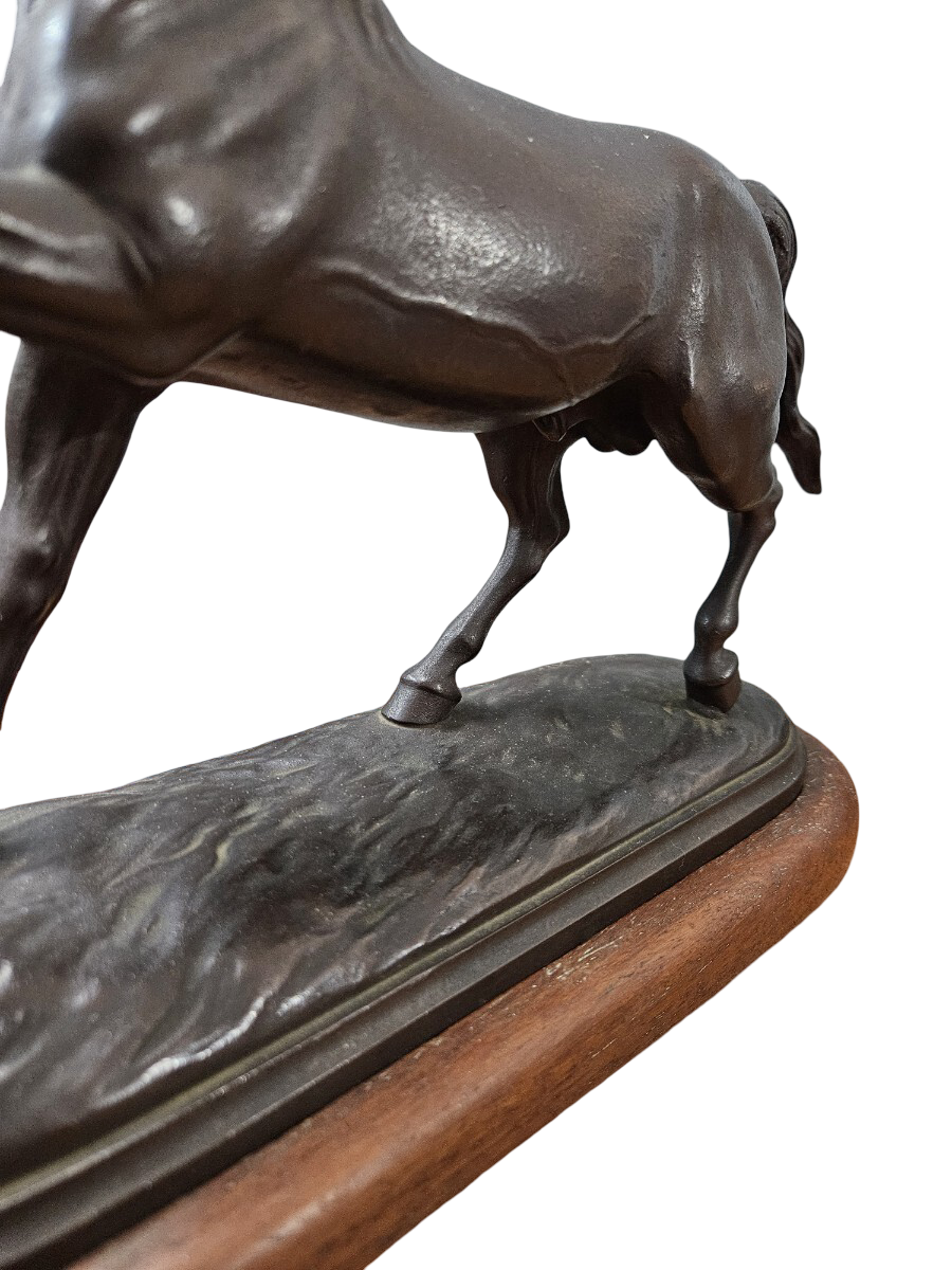 The lifted foreleg and balanced stance convey readiness without aggression, while the simplified mane and elongated neck emphasize rhythm and proportion. Mounted on its original wooden base, the piece was intended for refined interior display rather than public monumentality.