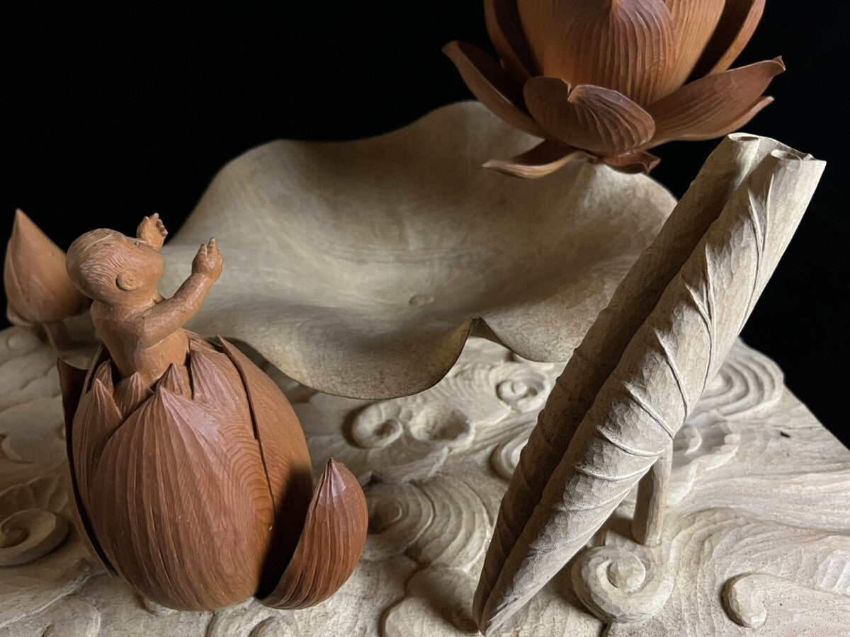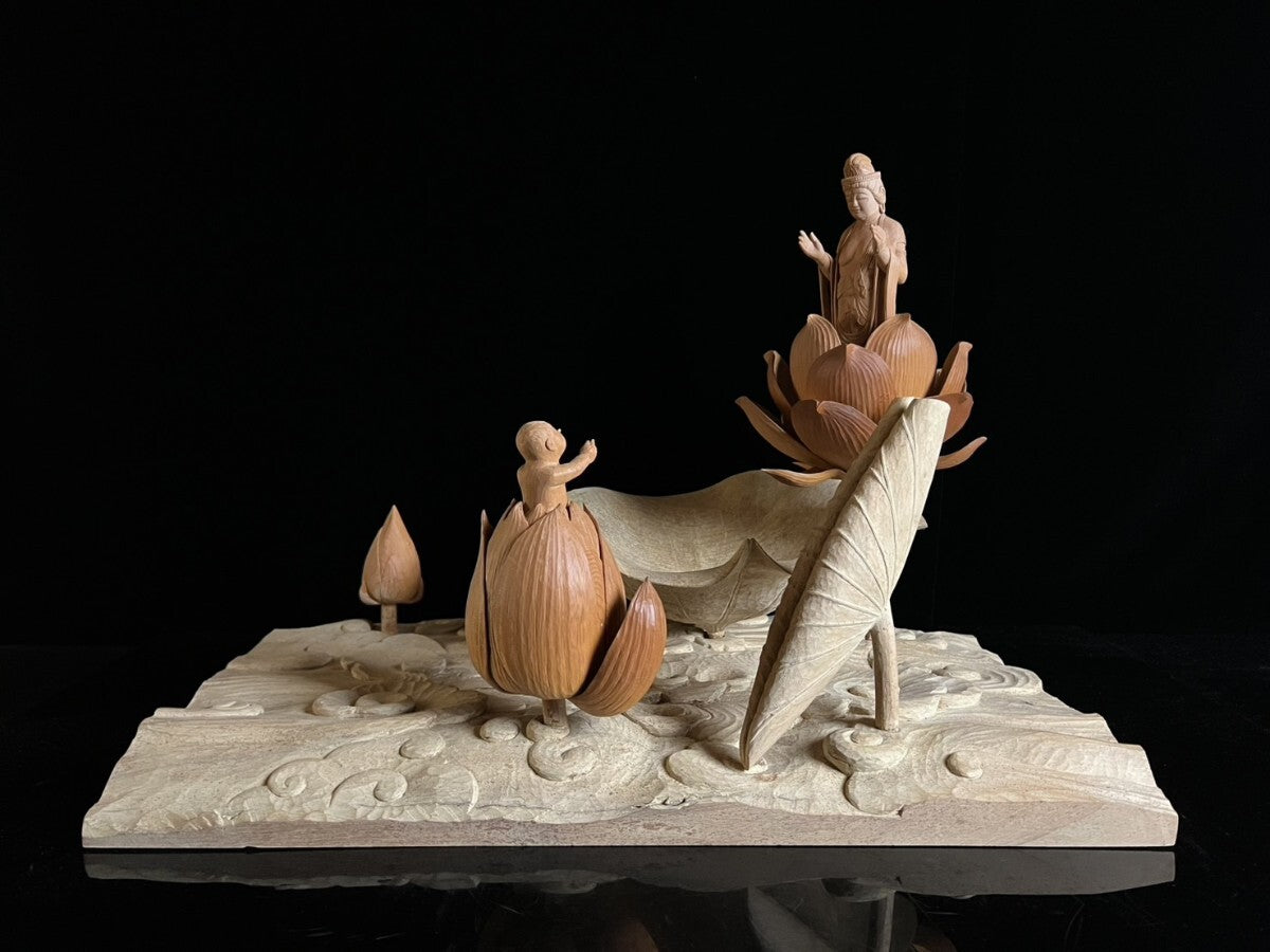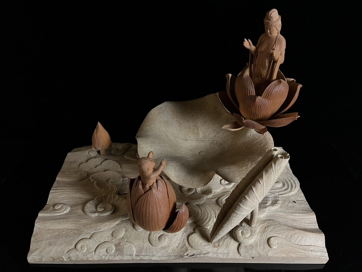Catalogue Note : A quietly dramatic devotional tableau centered on Jibo Kannon—the “Compassionate Mother” aspect of Kannon—rendered as a refined wood sculpture group staged among lotus forms. Conceived as a self-contained environment rather than a single figure alone, the composition reads like a private micro-altar: Kannon rising from the lotus, surrounded by pods and leaves that transform the work into an iconographic landscape of mercy, protection, and maternal refuge.