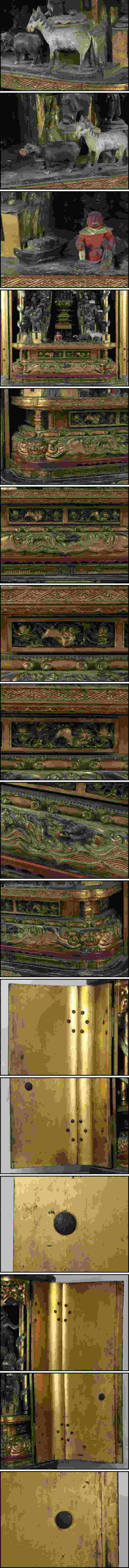 At approximately 100cm in height, the shrine’s presence is architectural. The doors open like a stage curtain to reveal a layered interior: a principal icon set deep in the sanctum, flanked and backed by multiple attendant figures, with additional rows of guardians and youthful acolytes building a sense of procession. This “many-figure” configuration is not decorative excess; it is a doctrinal and liturgical grammar. A single deity expresses a vow. A retinue expresses a functioning cosmos — roles, forces, and protections arranged around the vow so that it can act in the world.