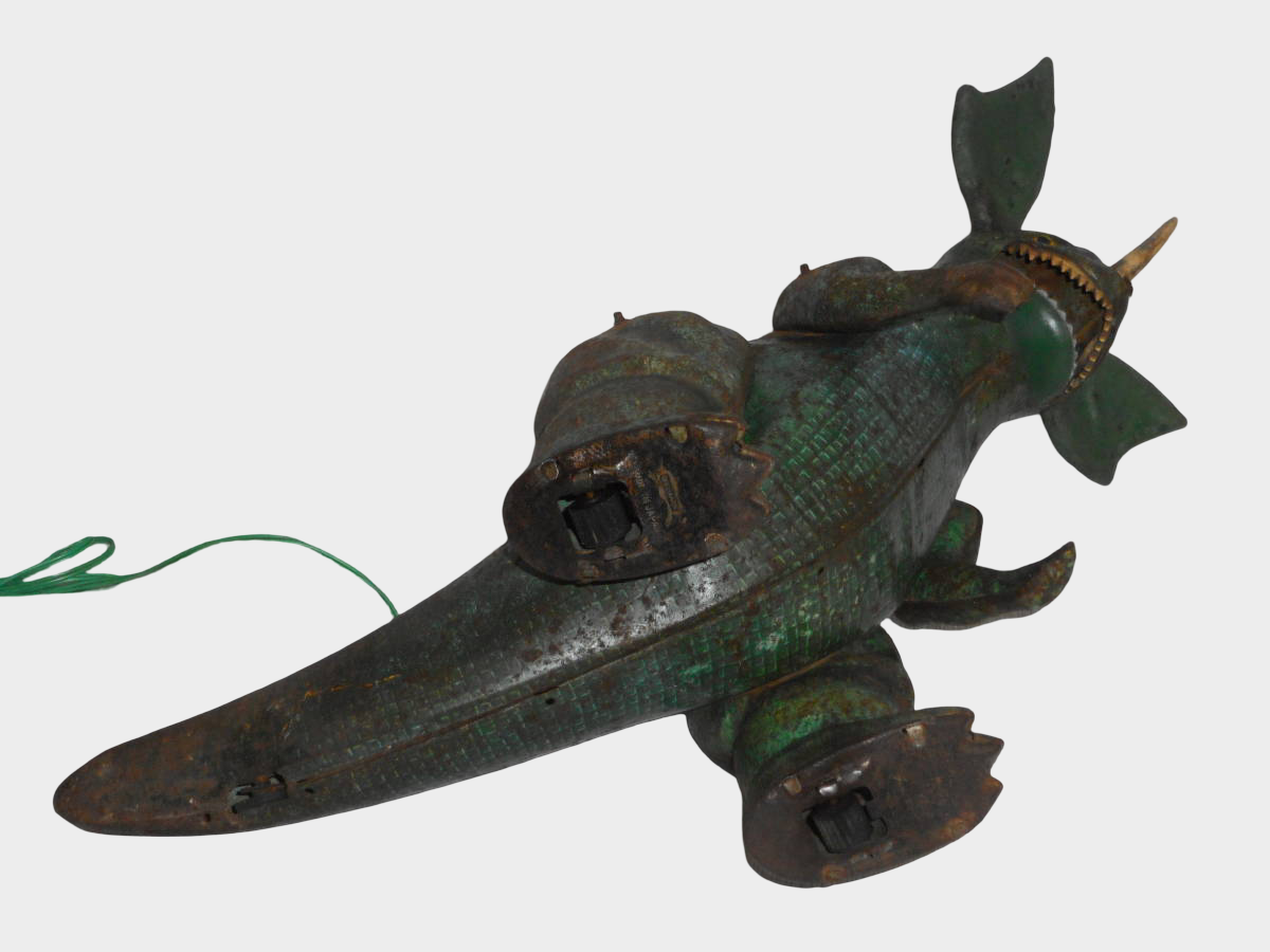 Large tin kaiju were heavily played with; intact examples are scarce. -