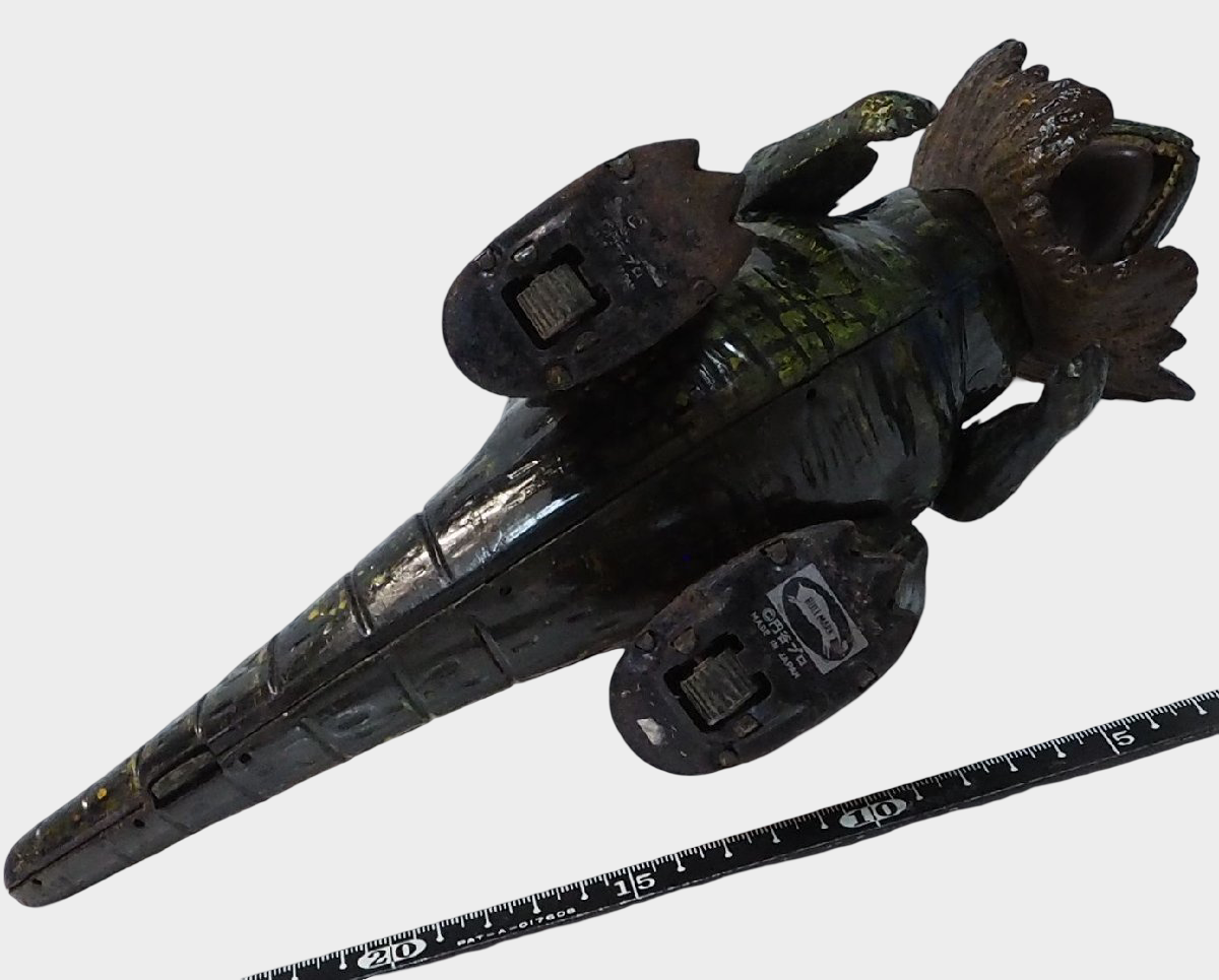 Large tin kaiju were heavily played with; intact examples are scarce. -