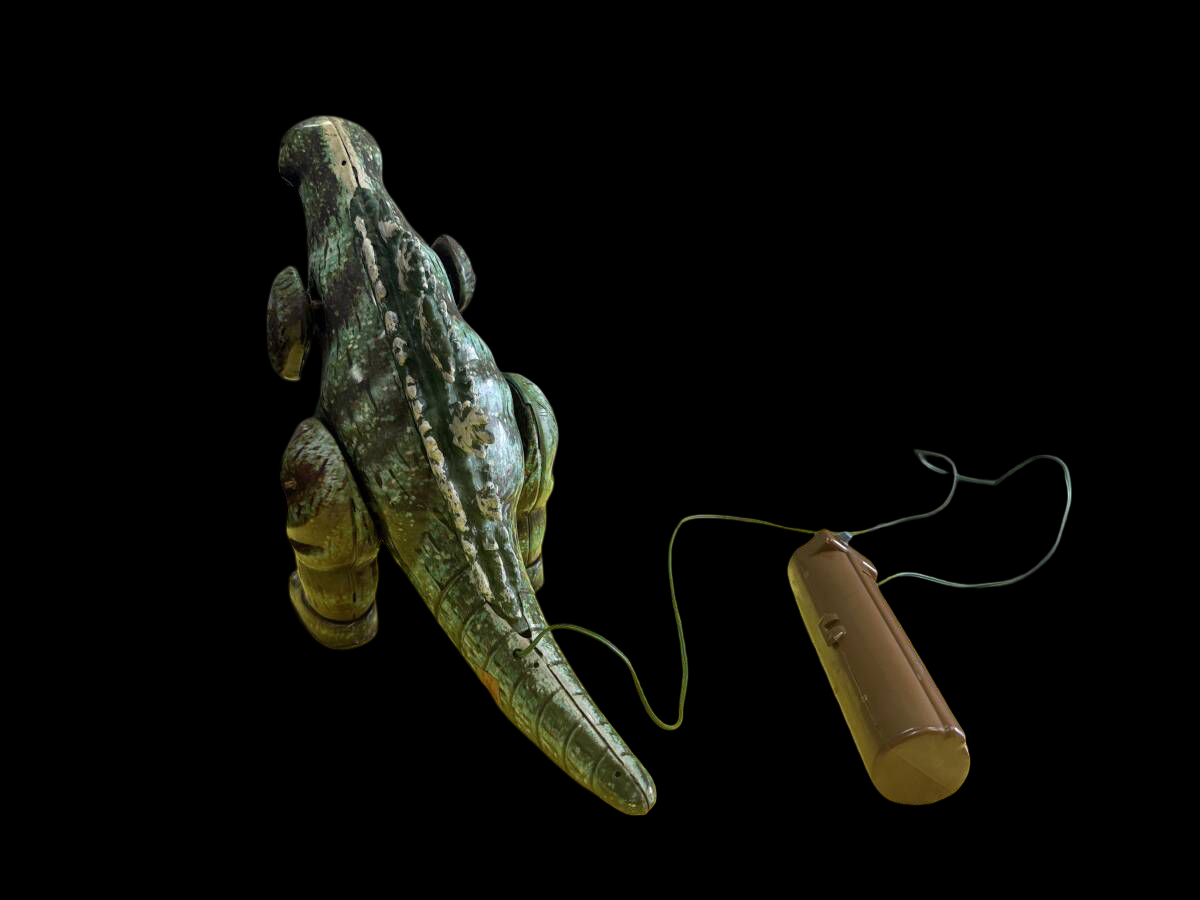 The walking Godzilla model exemplifies Bullmark’s design philosophy. Enlarged feet and a forward-leaning stance provide stability for the internal motor, while prominent dorsal plates and a compact torso amplify visual impact. When activated, the mechanism produces a deliberate stepping motion that echoes Godzilla’s iconic cinematic gait. Battery-operated kaiju toys were produced in smaller numbers than friction or pull-string variants, and survival rates are low due to mechanical fatigue, corrosion, and the inherent fragility of tin-plate construction.