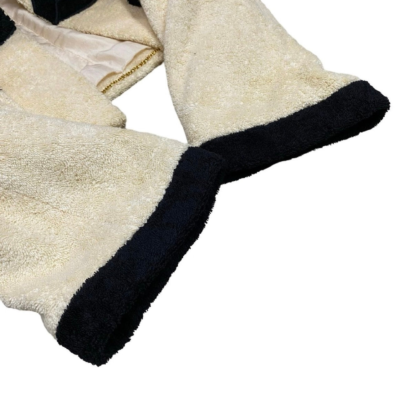 A statement of unmistakable Chanel heritage, this Coco Mark Collarless Jacket stands among the rarest boutique-issued pieces of the late 90s–early 2000s era. Crafted in a soft beige boucle with contrasting black appliqué details, it features the iconic oversized interlocking CC across the chest—a design reserved only for ultra-limited showroom and runway-adjacent creations. Its silhouette blends the femininity of a rounded neckline with the structure of timeless Chanel tailoring.