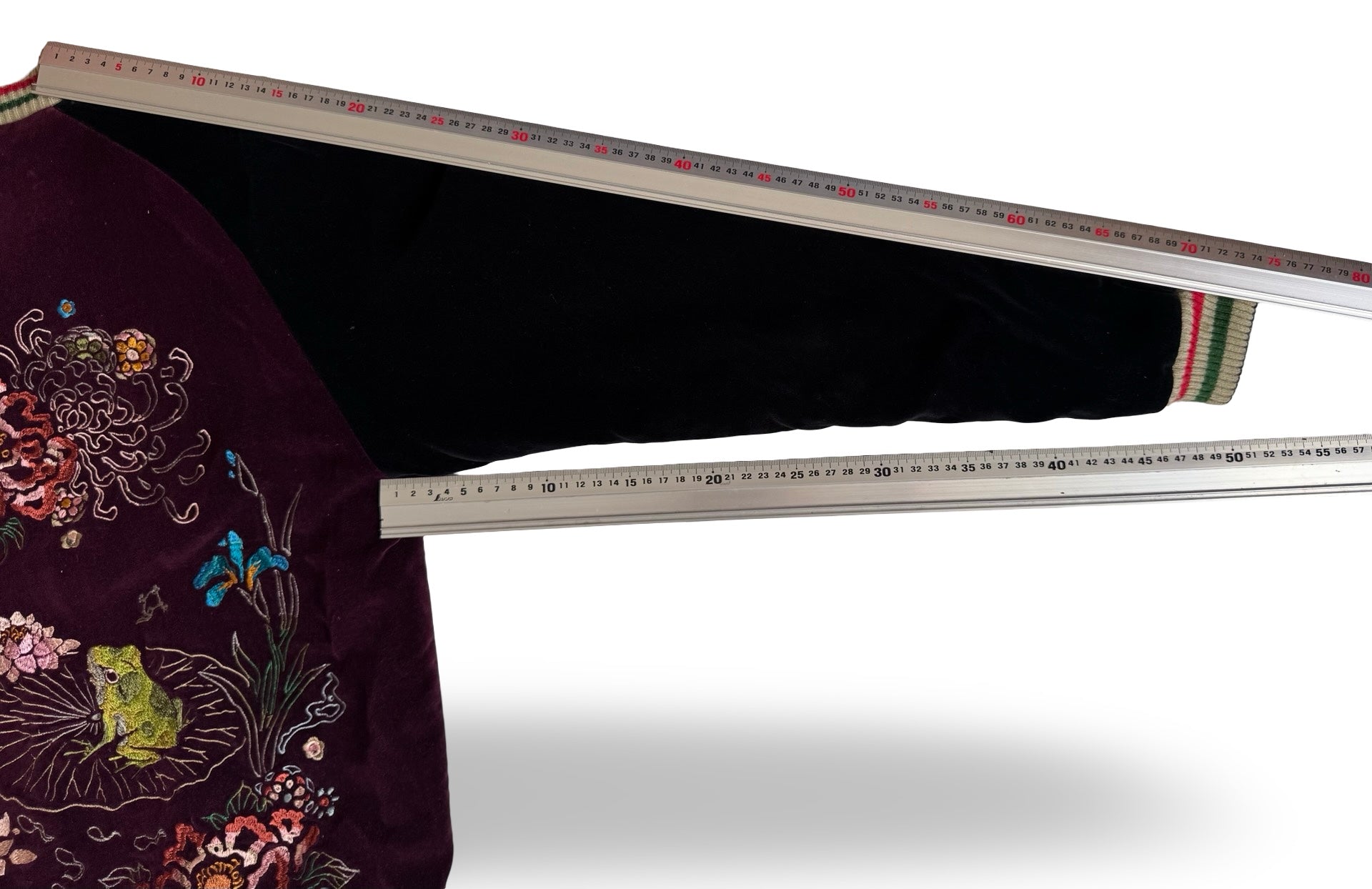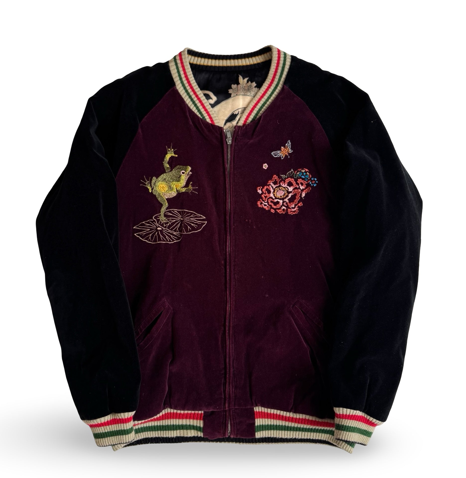 Flip the jacket, and an entirely different narrative unfolds: a vibrant frog poised among lotus blossoms, surrounded by richly embroidered peonies, water lilies, insects, and soft ripples. This design references both haiku imagery and classical Buddhist lotus symbolism, celebrating life, humor, and rebirth. The deep burgundy velvet base intensifies the colors, emphasizing the jacket’s luxurious, tactile presence.
