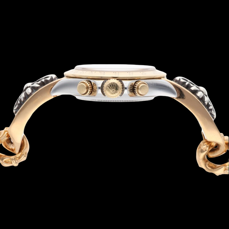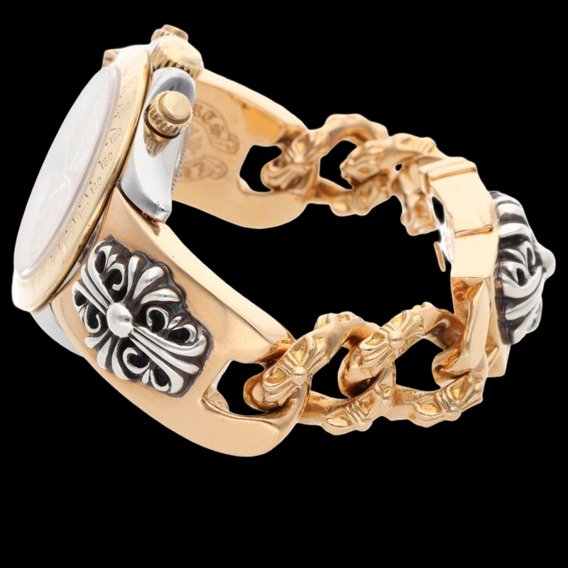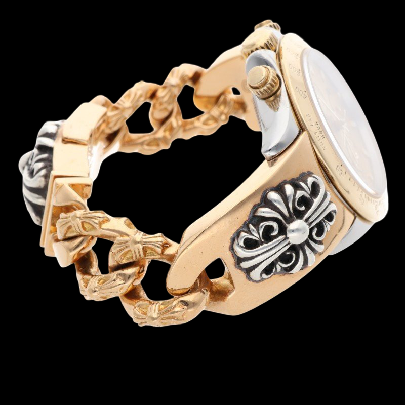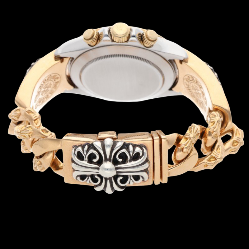 A convergence of fine Swiss horology and Los Angeles Gothic-luxury metalwork, this Chrome Hearts × Rolex Daytona hybrid represents the pinnacle of underground collecting culture. The base instrument, a Rolex Daytona 116523 in warm champagne tones, has been re-housed within a full Chrome Hearts fantasy-link bracelet architecture—executed in 22K yellow gold and sterling silver with signature Keeper and CH Cross motifs.