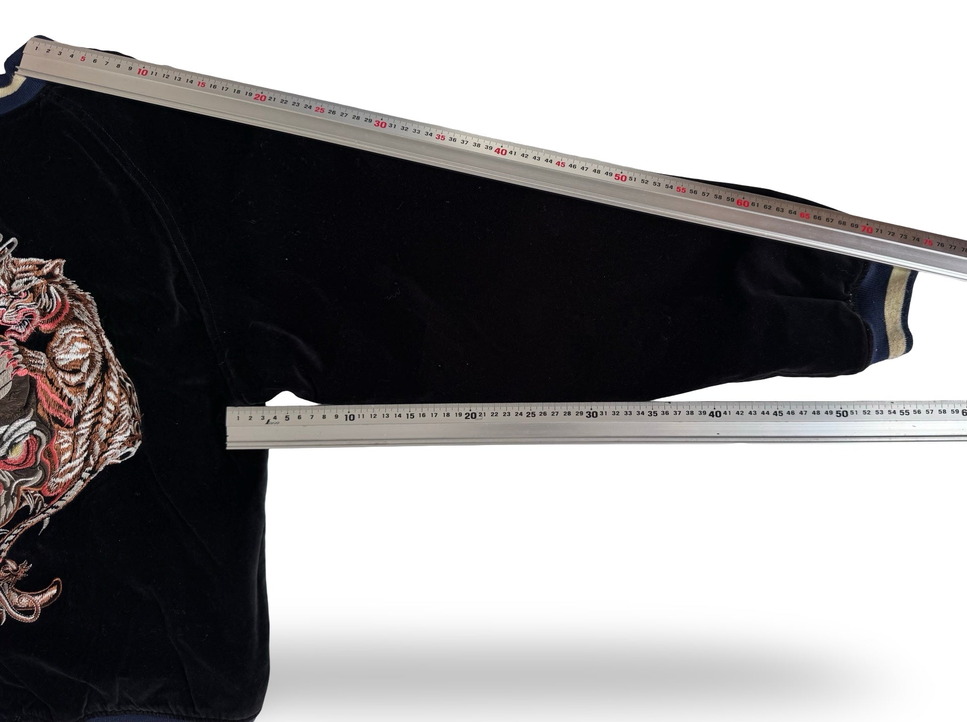 The front remains equally compelling: a roaring tiger on the left chest meets a sinister skull medallion on the right, accompanied by embroidered kanji (龍虎 / “Ryūko” — Dragon & Tiger), a classic pairing representing cosmic balance, power, and survival. The velvet texture enhances the embroidery’s depth, creating dramatic shadows and a luxurious tactile presence.