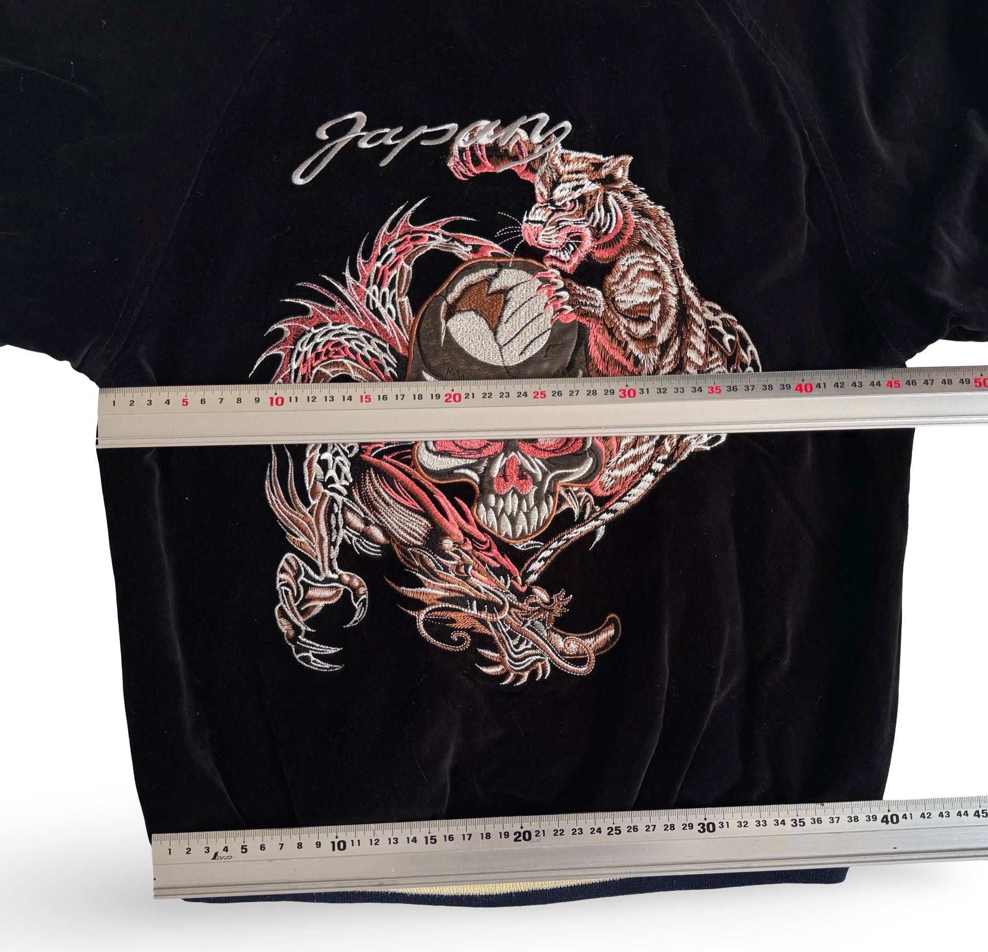 Step into the intensity of old-school Japanese sukajan artistry with this velvet Tiger × Skull embroidery jacket, a striking fusion of folklore power and modern hardcore aesthetics. Crafted in heavy velour with dense multi-layered embroidery, this piece channels the classic Yokosuka spirit — bold, rebellious, and unmistakably Japanese.