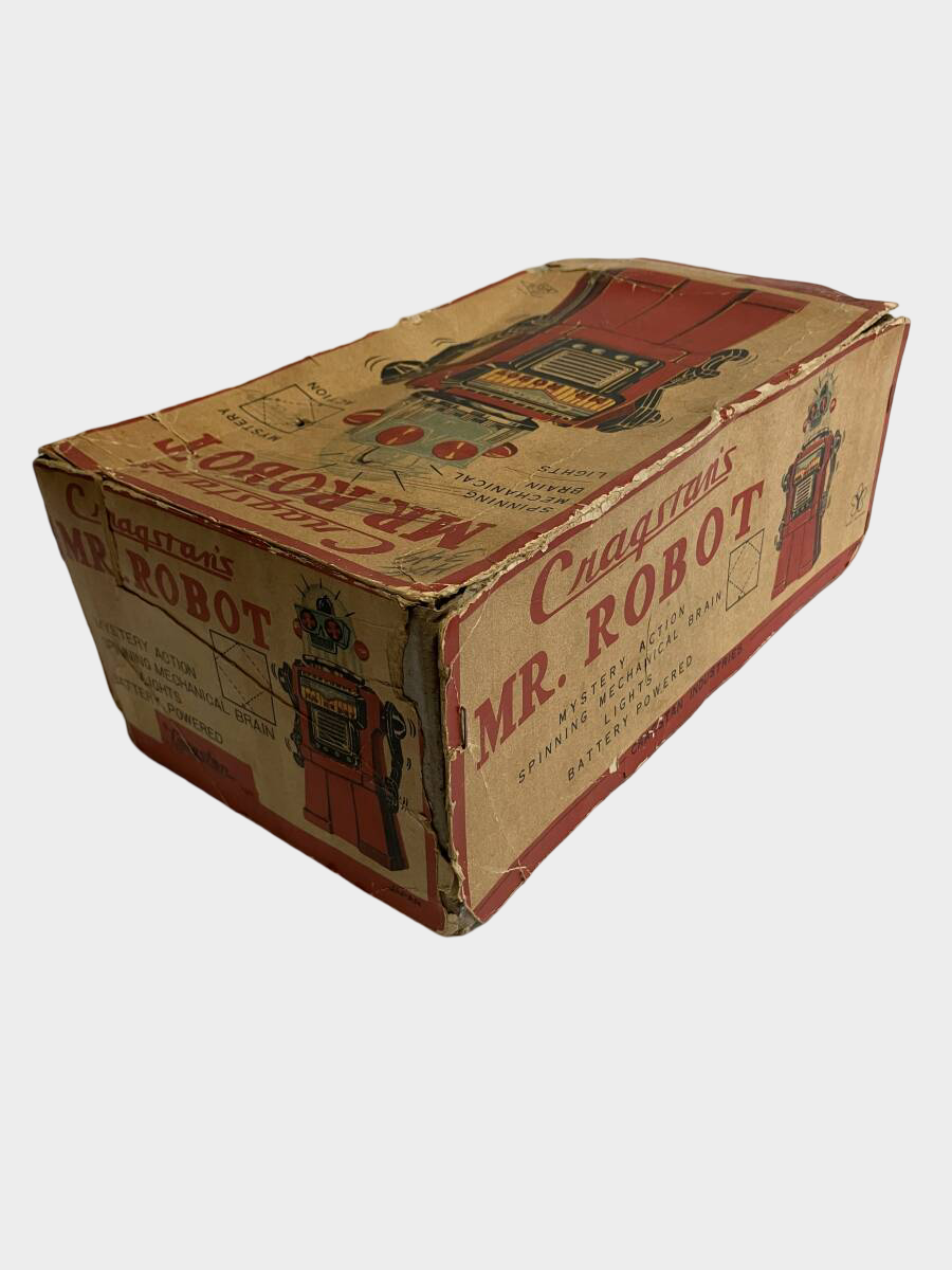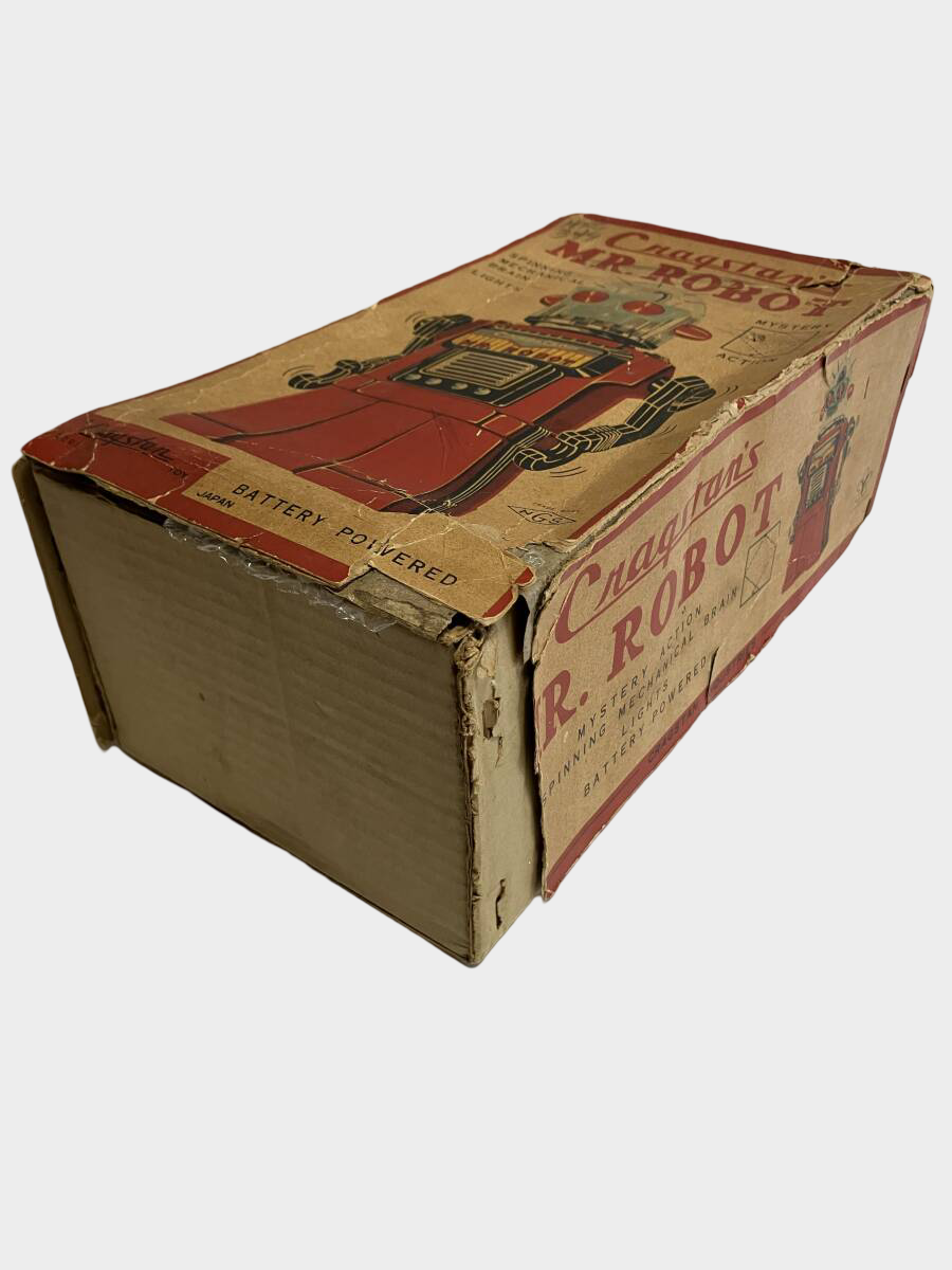 A cornerstone robot of the early-1960s Space Age, Cragstan Mr. Robot is a Japan-made, battery-driven tin icon engineered for spectacle: a skirted body with bold export-era lithography, a clear dome head that stages the “mechanical brain” effect, and classic mystery-action movement language that defined the period. With its original box present, this example sits in the high-collectability tier where packaging becomes part of the artifact, not merely a container.