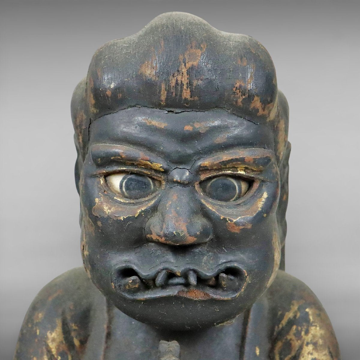 While specific identification (such as a named Myoo or temple guardian) cannot be confirmed due to surface wear and the absence of inscriptions, the iconography strongly supports interpretation as a protective deity associated with vigilance, moral restraint, and boundary defense. This attribution is presented as informed scholarly context rather than definitive claim.