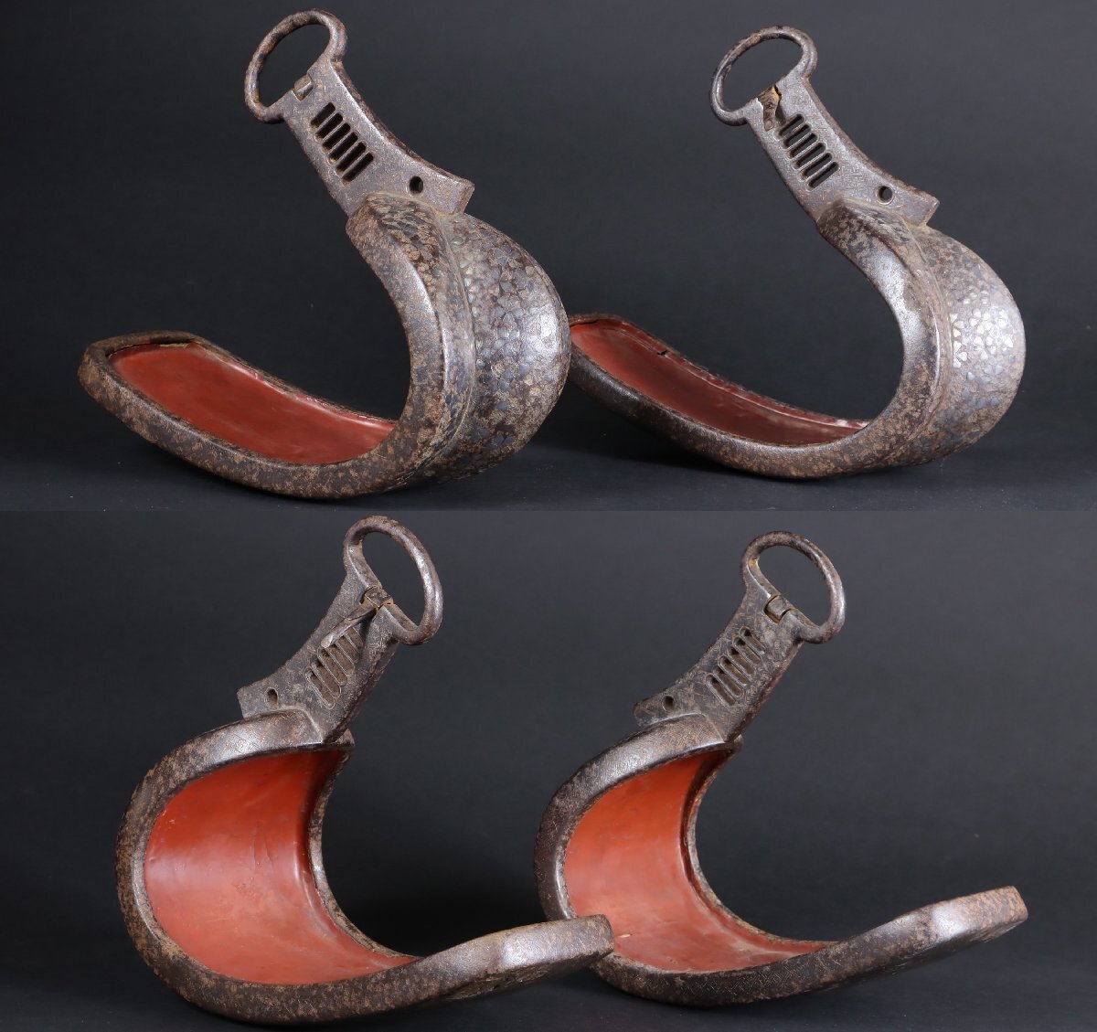 The interiors retain traces of red lacquer, a functional and symbolic choice. Lacquer protected the iron from moisture introduced by footwear and weather, while the red pigment echoed auspicious associations of vitality and protection. Over time, wear, oxidation, and surface loss have softened these elements, producing an honest patina consistent with prolonged use and age.