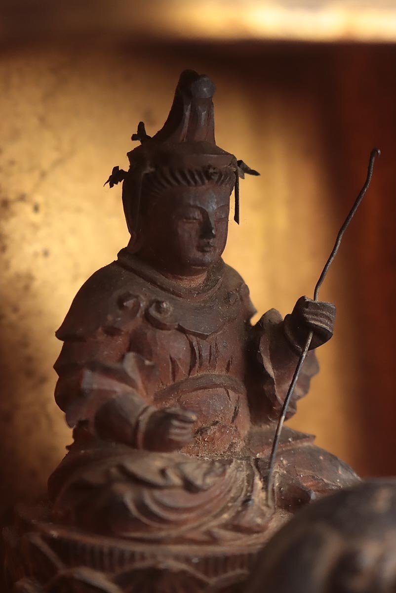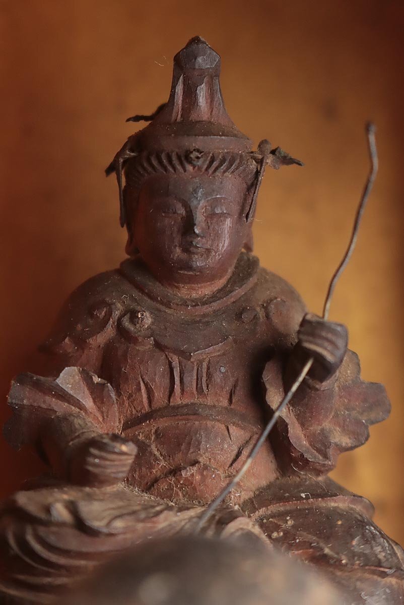 Surface wear, pigment loss, minor chips, and patina are present throughout, consistent with Edo-period devotional use. These features affirm authenticity and historical depth.