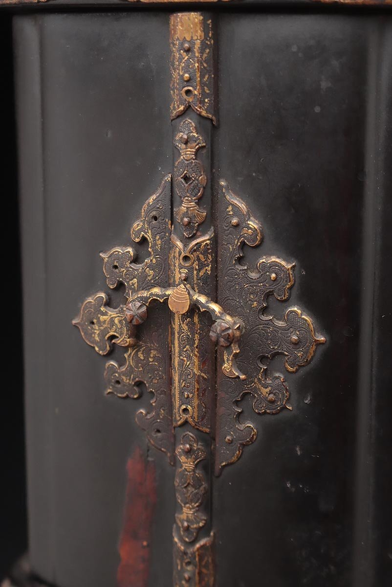 This Edo-period wooden zushi enshrines Monju Bosatsu (Manjushri), the bodhisattva of transcendent wisdom, depicted riding his traditional lion mount. Designed for private devotion, this shrine reflects the intellectual and contemplative practices of early-modern Japan.