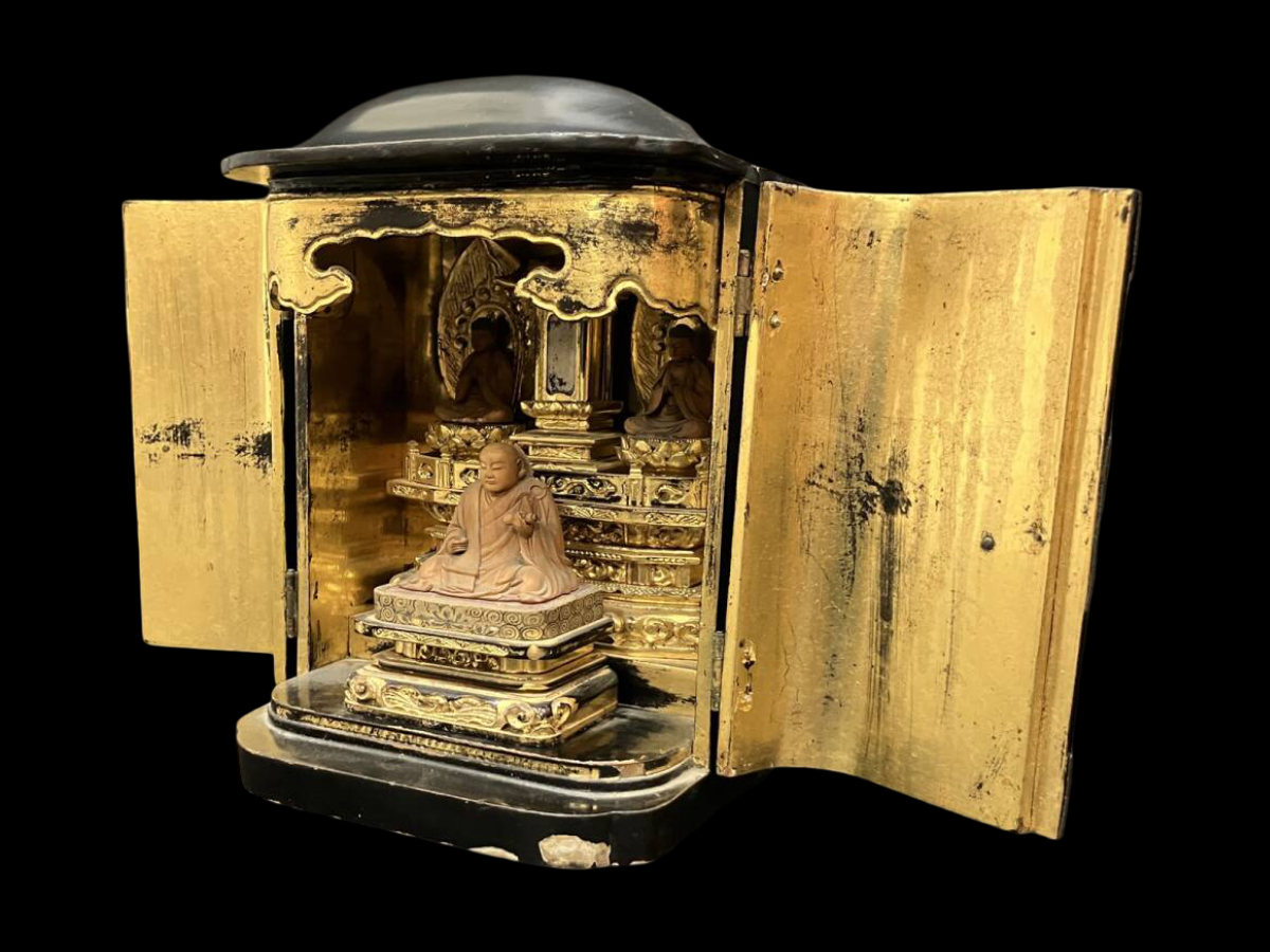 Edo Period Giltwood Portable Zushi Shrine — Nichiren Shonin with Triratna (Sanbōson), Black Lacquer & Gold, Japan