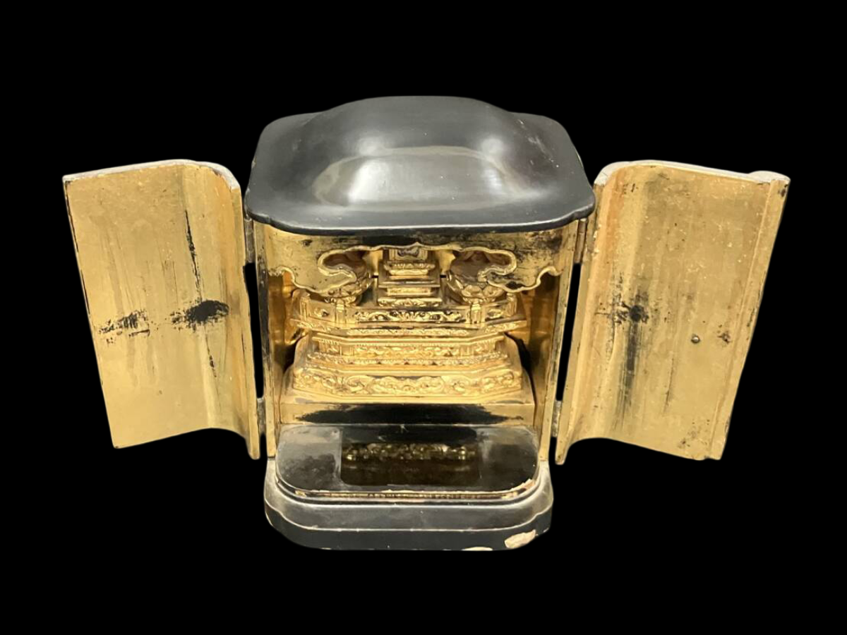 The exterior presents in restrained black lacquer, bearing the marks of time—abrasions, rubbing, and patina consistent with devotional use. These signs of age enhance the object’s authenticity, situating it firmly within lived religious practice rather than decorative reproduction.