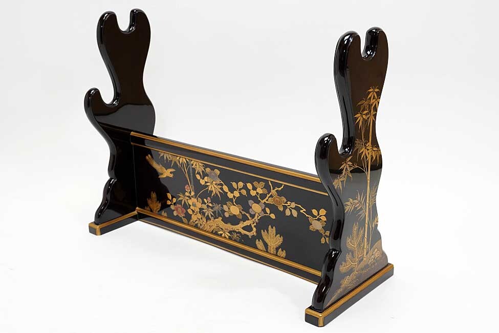 Edo-Period Black Urushi Katana-Kake Sword Stand with Gold Maki-e — With Original Storage Box