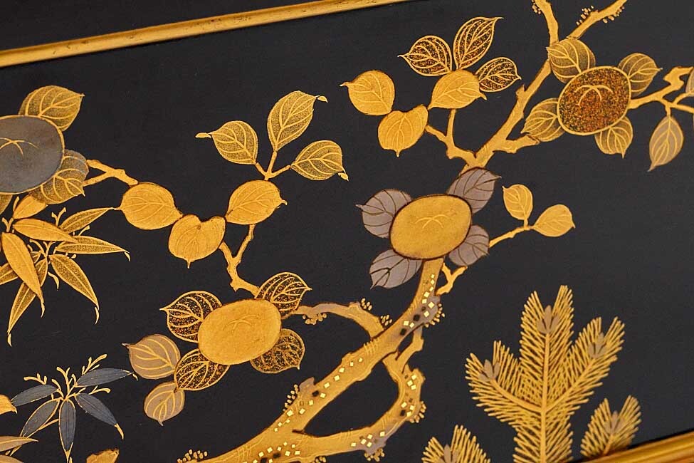- Gold maki-e floral scrollwork: A classic vocabulary for lacquer furnishings—elegant, readable up close, and appropriate for domestic display rather than court-level density.