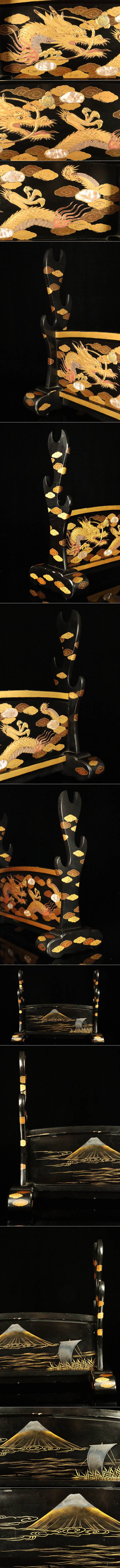 Edo-Period Style Japanese Lacquer Sword Stand, Maki-e Dragon & Mount Fuji, Shell Inlay Raden , Katana Rack Display (49cm)