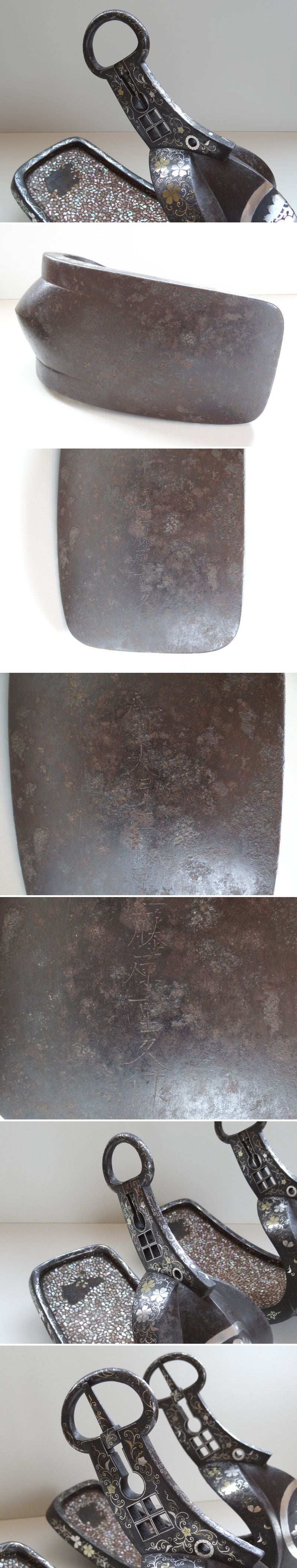 Edo Period Japanese Samurai Abumi Stirrup Pair Silver Inlay Kamon Pine Crest Signed Owari