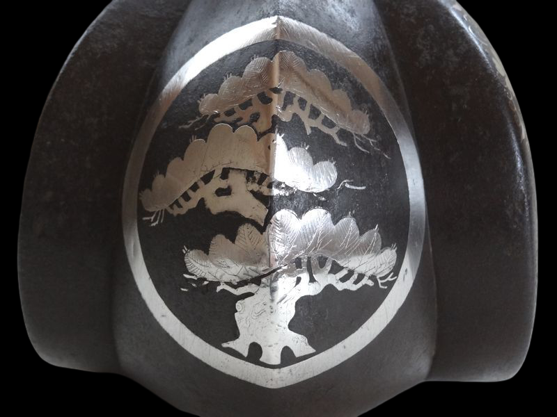 Beyond heraldry, the surface is enriched with sakura karakusa (cherry blossom arabesque) motifs rendered in silver inlay. The juxtaposition of pine and cherry blossom is deliberate: pine endures through winter, while cherry blossoms embody impermanence and the fleeting beauty of life. Together, they articulate a complete samurai worldview—discipline balanced by poetic awareness.