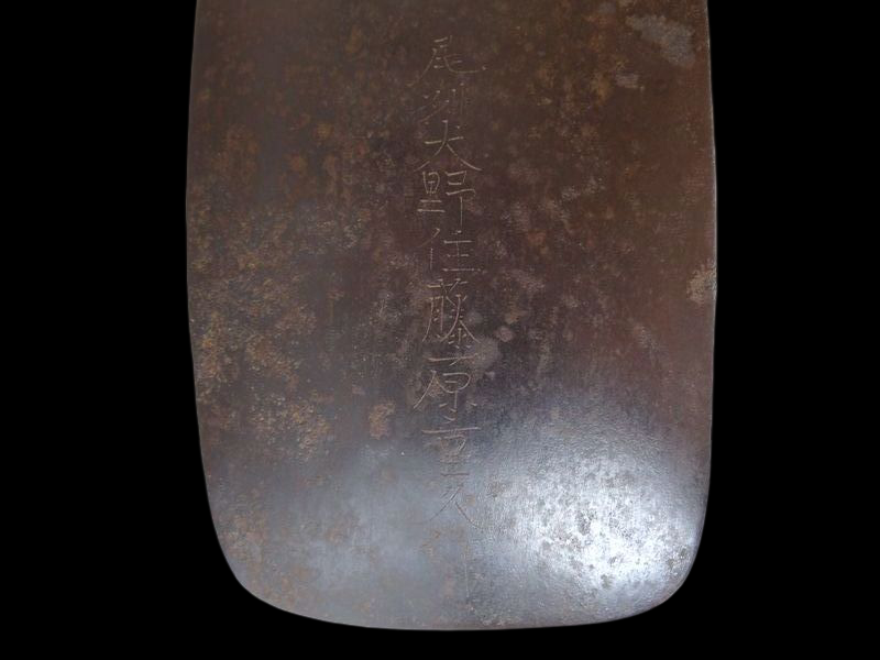 This crest format is closely associated with clans of the Owari region, where refined heraldic systems developed alongside some of the most technically advanced metalworking schools of the Edo period. The inscription naming Fujiwara Shigehisa situates the work within a lineage-conscious tradition, invoking the prestige of the Fujiwara name as both ancestral reference and mark of cultivated legitimacy.