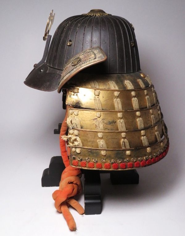 Authentic Edo Period Japanese Samurai Kabuto Helmet — Signed Bizen Muneji — Iron Plate Bowl with Gilt Maedate Crest and Shikoro Neck Guard, Museum-Grade Armor