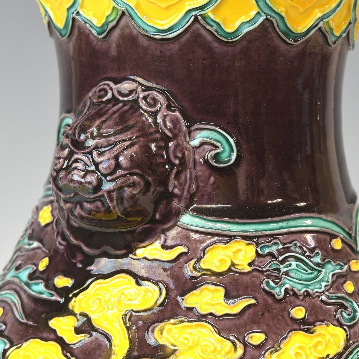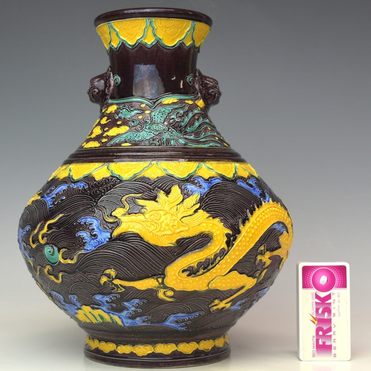 The surface is described in the listing as purple Kochi (kochi-style) glazing—an established color field associated with classical taste and disciplined firing. The relief work emphasizes the dragon’s body and movement in a way that reads clearly from across a room. This is not a miniature "detail piece"; it is built to be readable at distance. The vessel shape provides a stable body mass for arrangement, while the rim and shoulder proportions keep the silhouette elegant rather than heavy.