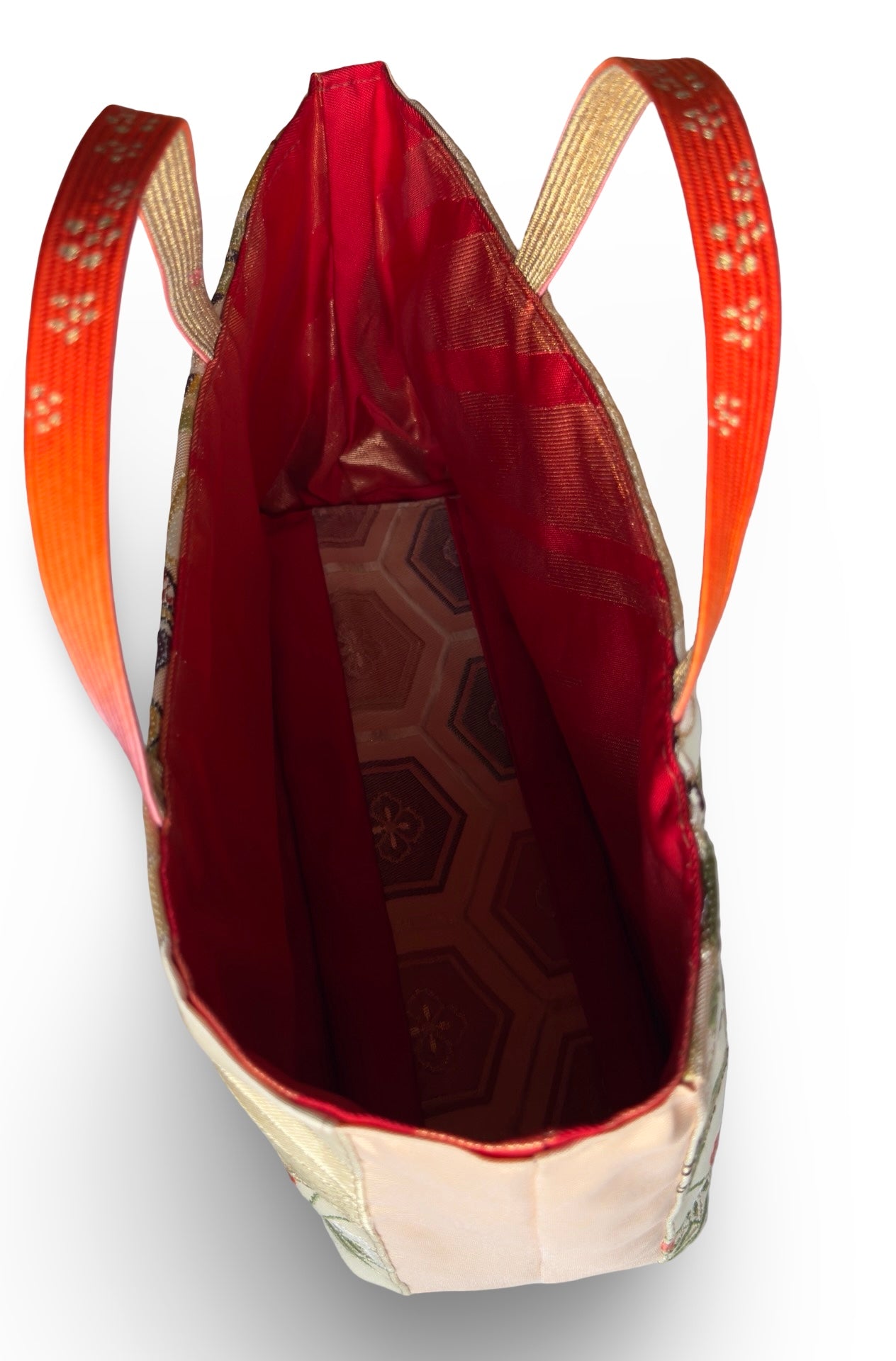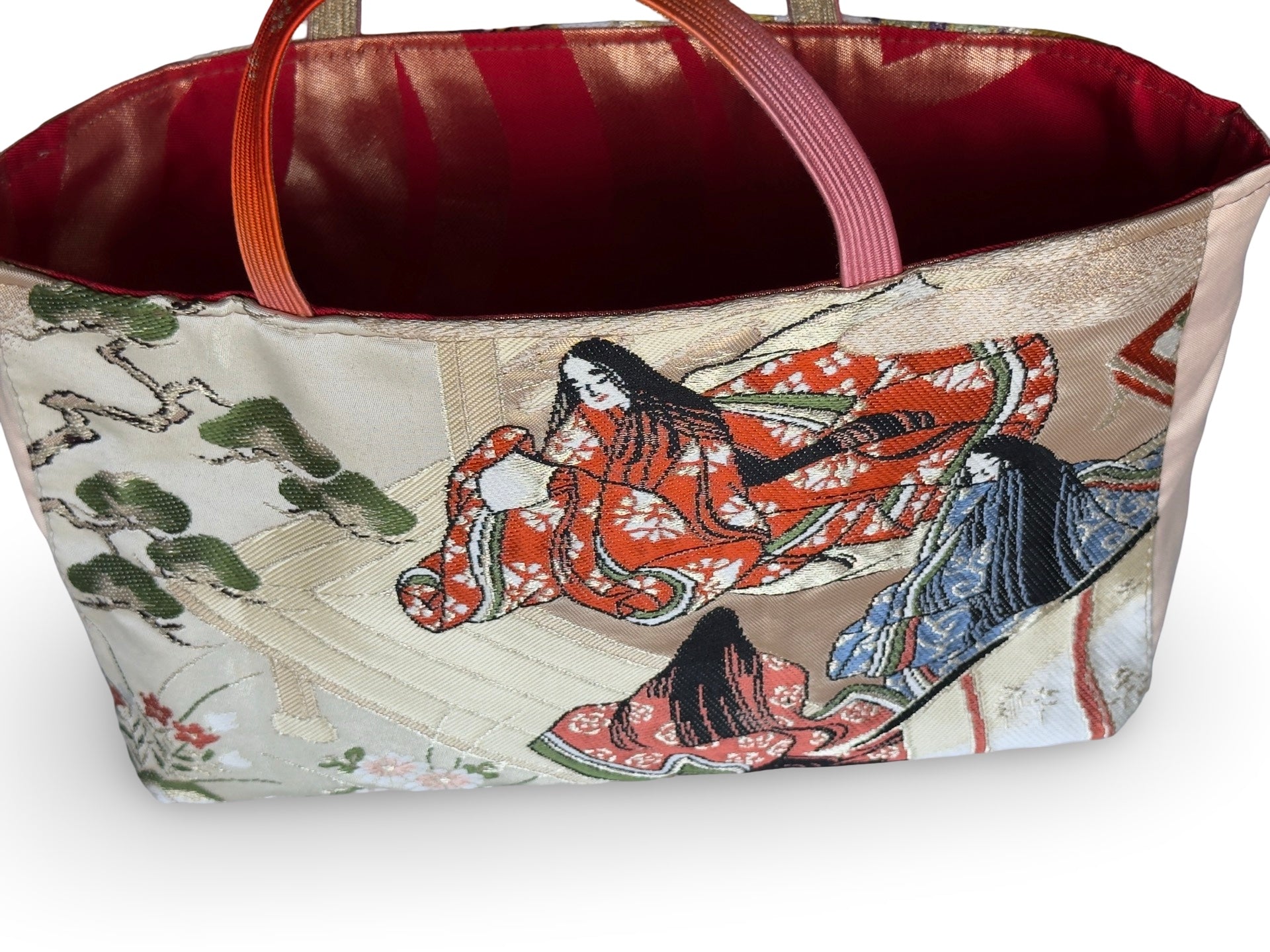 The artisan who created this remake piece retains the dignity of the original textile while transforming it into a functional modern bag. Its symmetrical double-sided design ensures that whichever way the tote is carried, an opulent Heian court tableau unfolds before the viewer. The red inner lining adds richness and visual warmth, echoing the inner layers of traditional court garments.