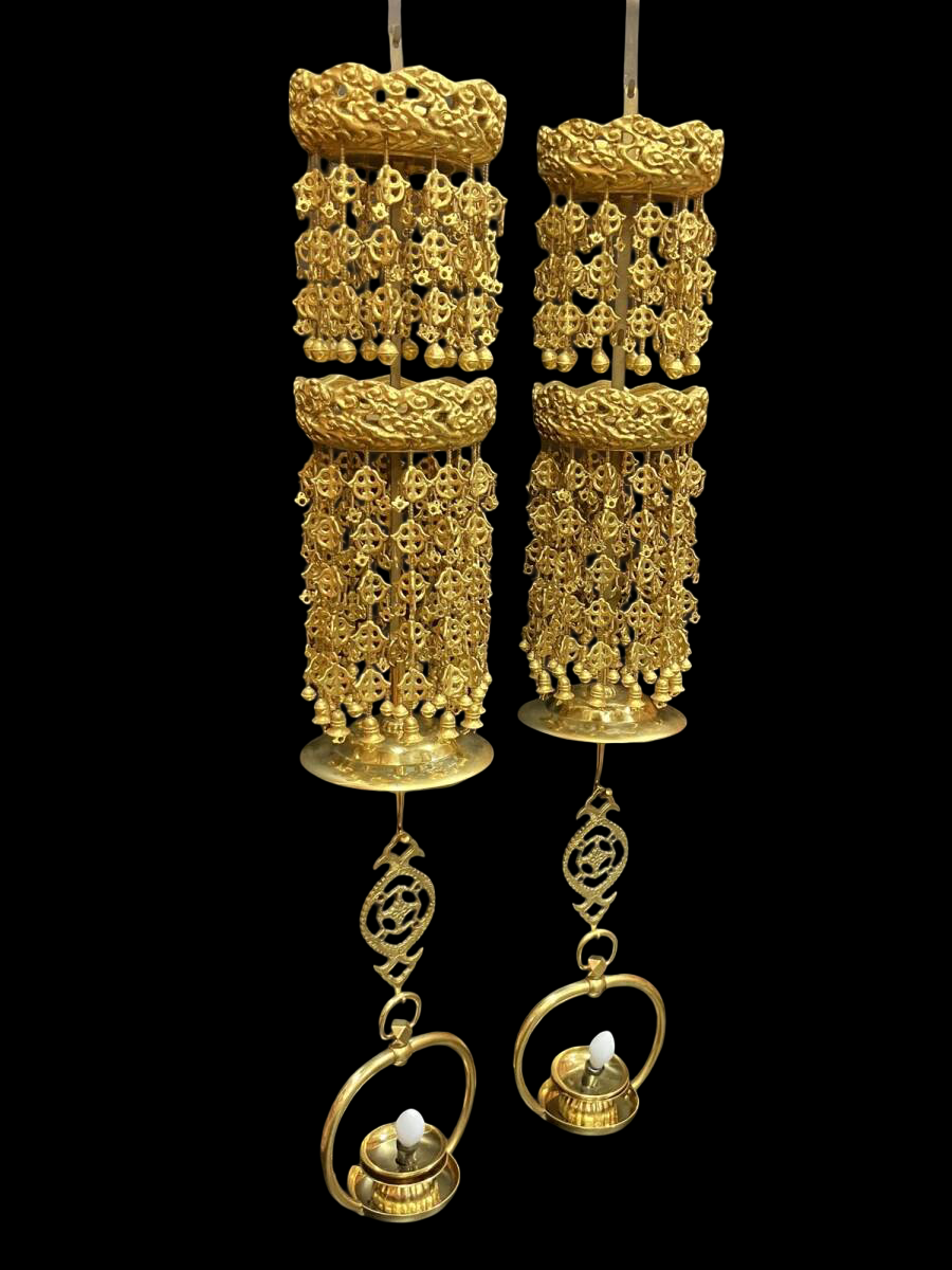 Large Gilt Metal Hanging Altar Lantern Pair — Double-Ring Yoraku Style, Multi-Tier Chain Drops (8-tier format) with Electrical Wiring — Temple-Scale Interior Hardware (Approx. 82 cm Drop)