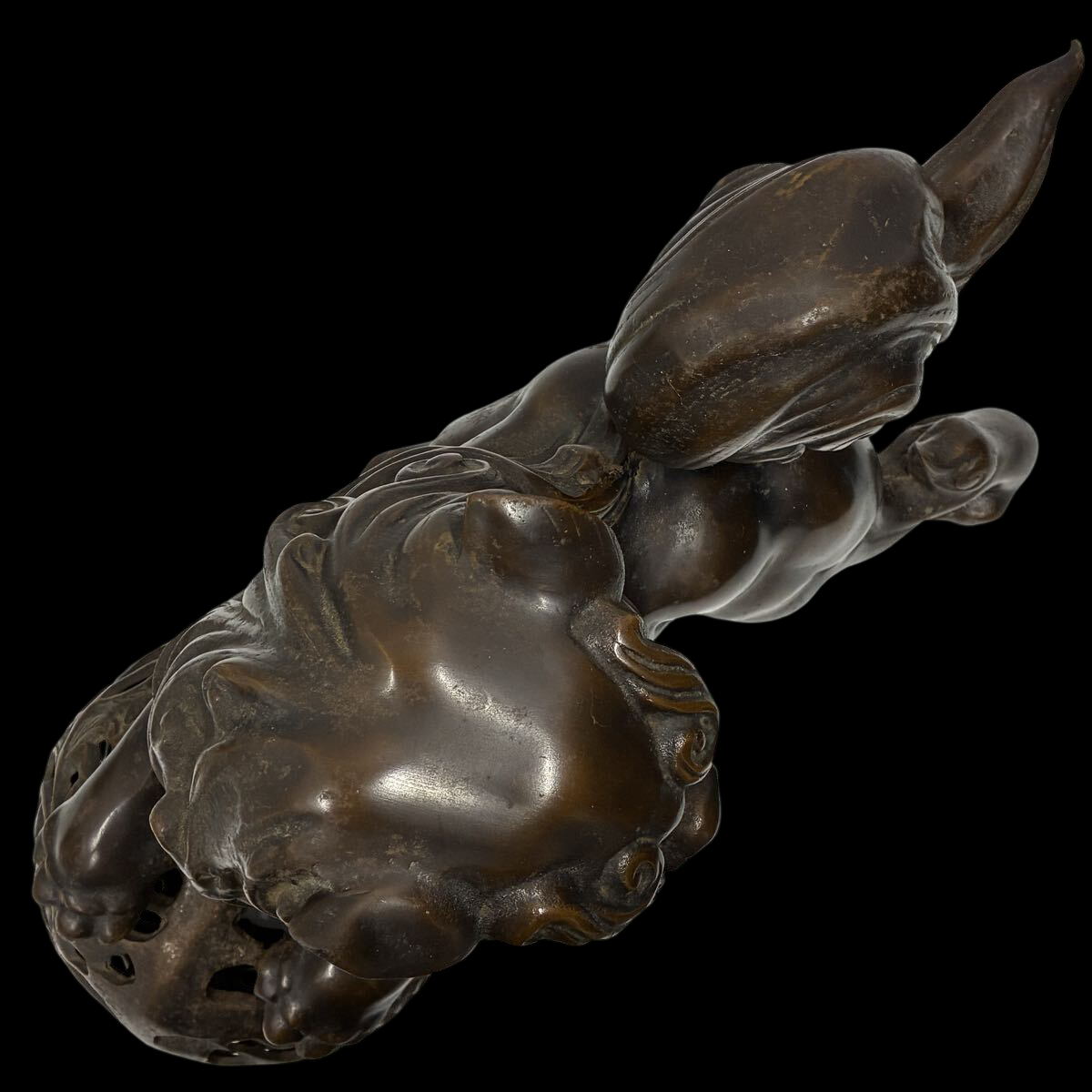 This metal guardian lion sculpture, depicted with a pierced jewel ball beneath its forepaw, is a decorative Japanese okimono intended for interior display. Executed in dark-patinated metal, the figure emphasizes movement, strength, and symbolic guardianship rather than ritual function.
