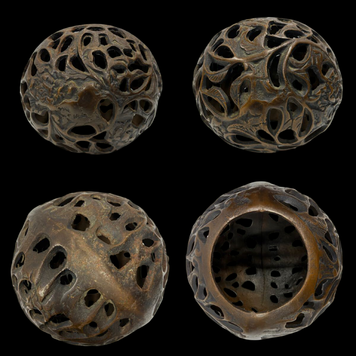 The lion’s exaggerated mane, raised tail, and muscular stance reflect stylistic conventions commonly seen from the late Meiji through early Showa periods, when traditional protective imagery was adapted for domestic interiors and export-oriented decorative arts. The openwork jewel ball represents wisdom, protection, and the containment of chaotic forces.