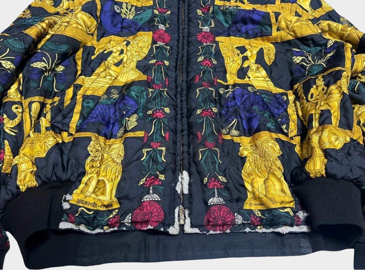 This piece represents Hermès at its most intellectually expressive moment, when the house translated its legendary silk carré language into architectural garments rather than accessories. During the late 1980s and early 1990s, Hermès experimented with reversible blousons that treated silk not as decoration, but as structural narrative material.
