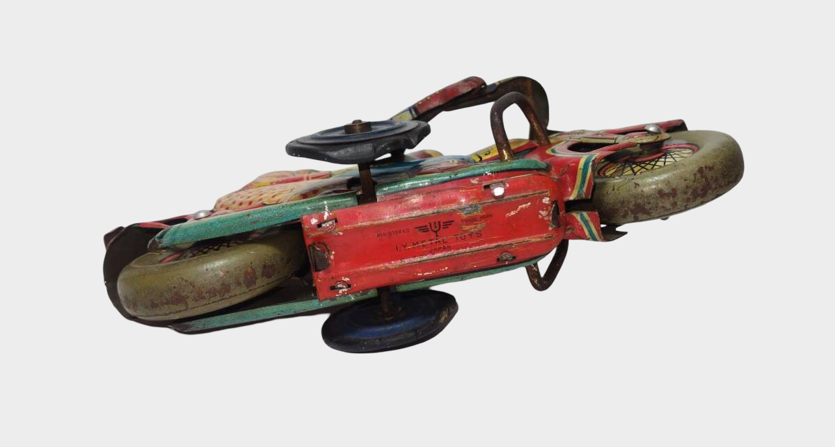 In the fragile calm of postwar Japan, objects of play quietly became vessels of aspiration. Produced in 1953—just eight years after the end of the war—Romance Motorcycle by I.Y. Metal Toys belongs to the earliest generation of Japanese tinplate works that transformed scarcity into optimism through design.