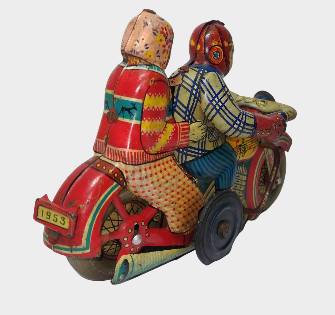 At first glance, the object appears charming: a motorcycle, two riders seated in tandem, rendered in vivid lithographed color. Yet beneath this surface lies a deeper narrative. The choice to depict two figures, rather than a solitary rider, is not incidental. It introduces companionship, continuity, and shared direction—an emotional proposition embedded directly into a mechanical toy. Motion here is not merely physical; it is symbolic.