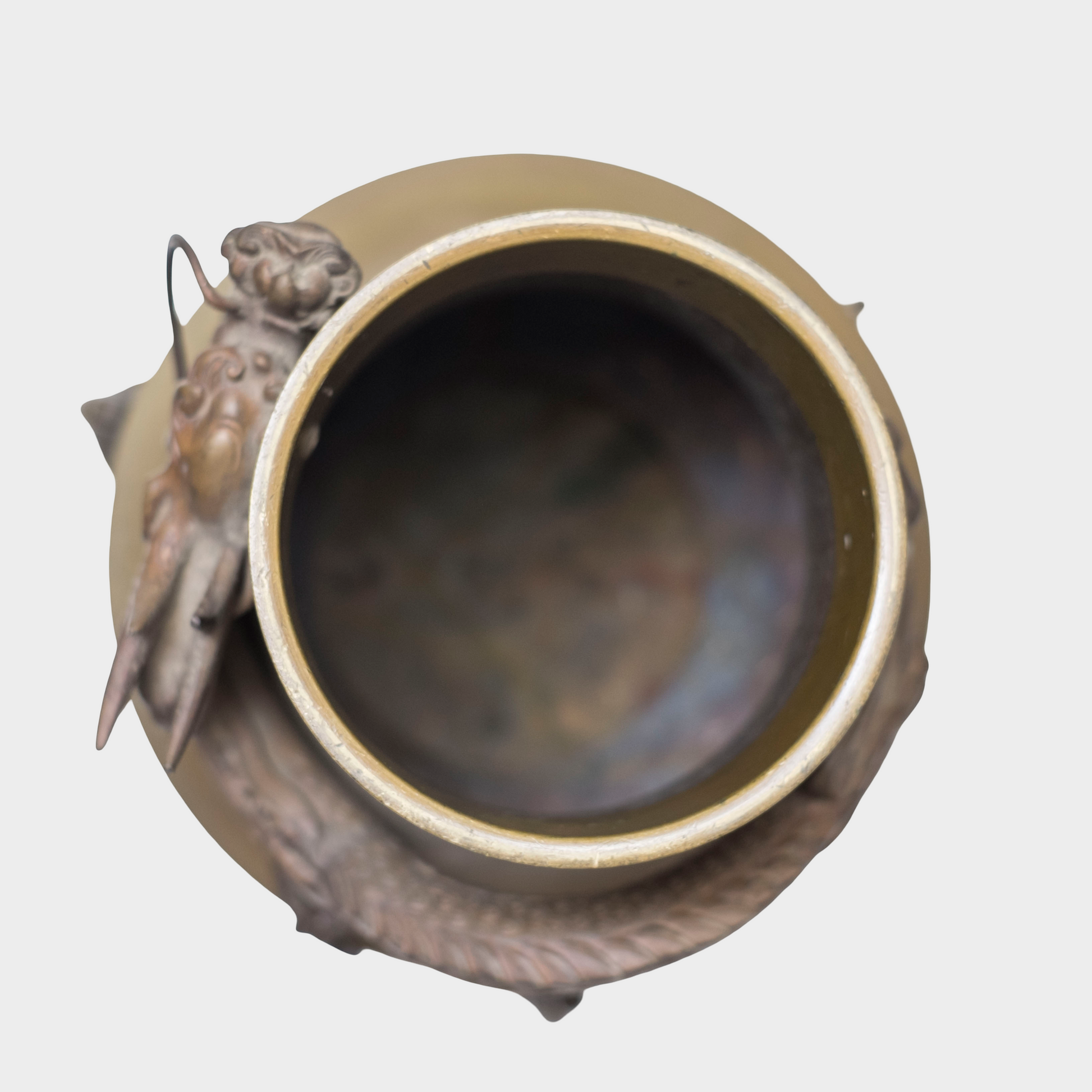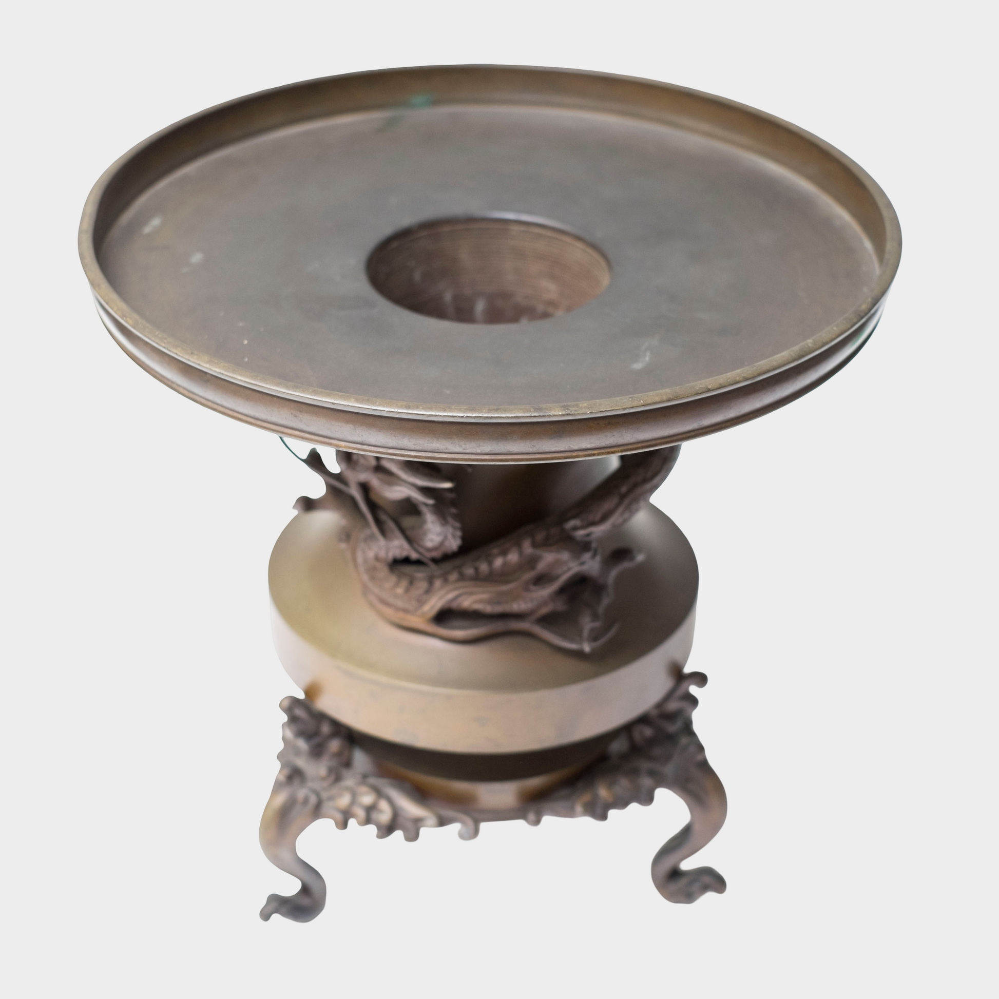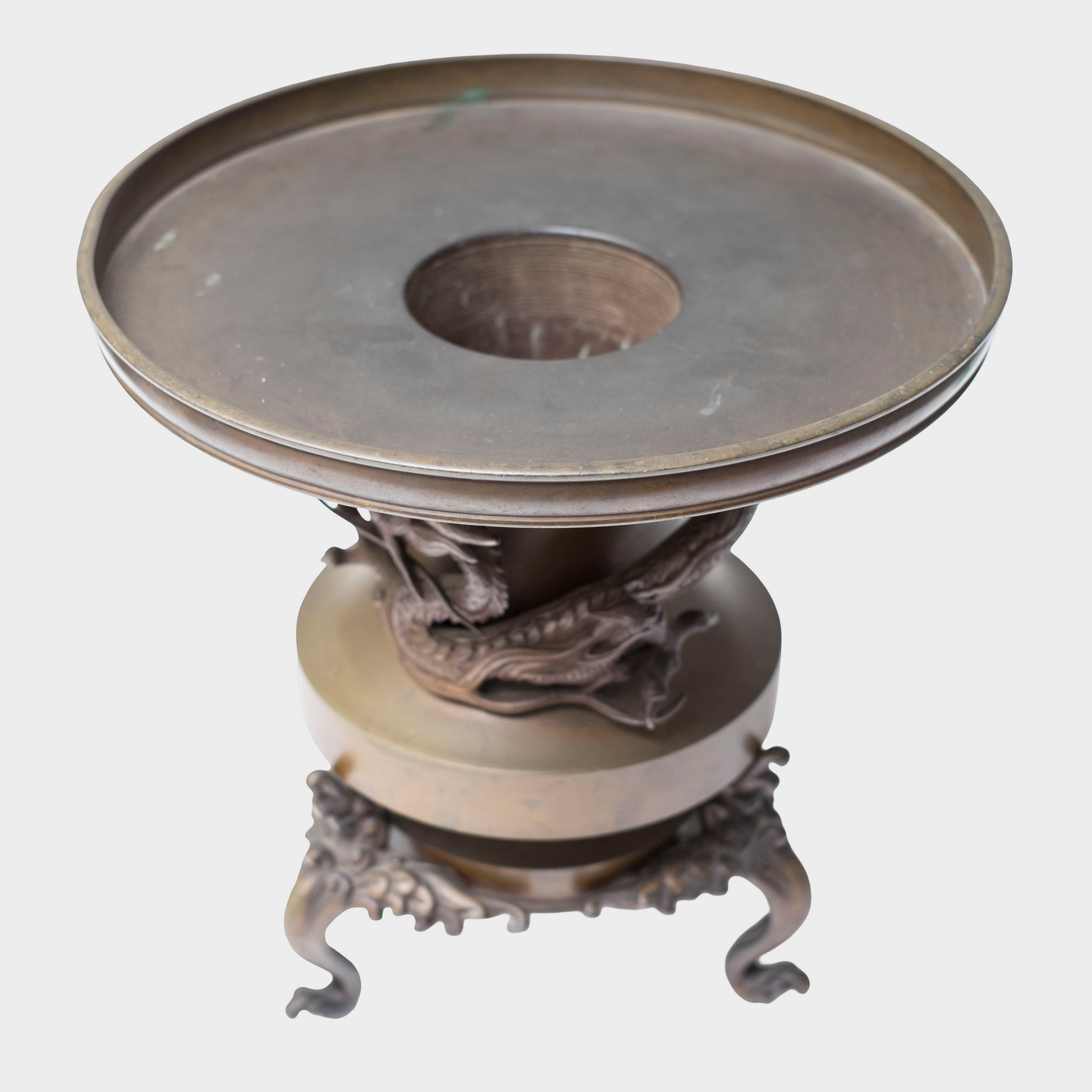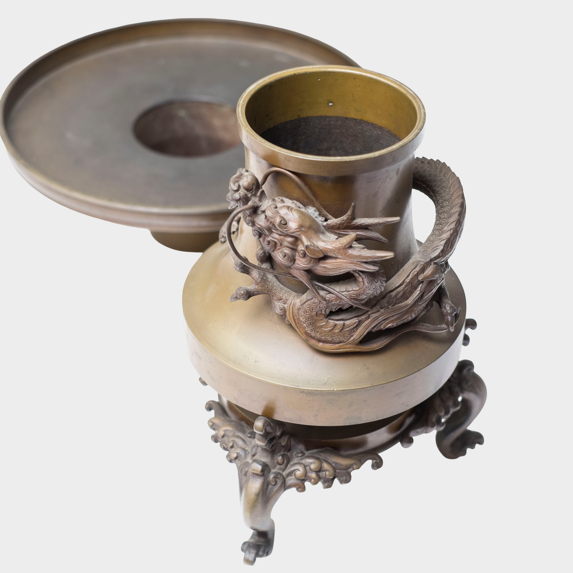 Stylistically, the piece aligns with late Edo to early Meiji bronze traditions, a transitional period when technical mastery reached its peak while aesthetic tastes began to favor bold sculptural expression. The confident modeling of the dragon, the harmonious integration of structure and ornament, and the restraint shown in allowing the form itself to carry authority all point to a skilled metalworking atelier operating at a high level.