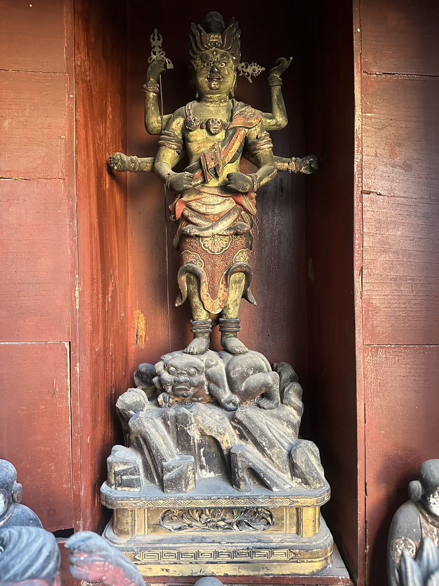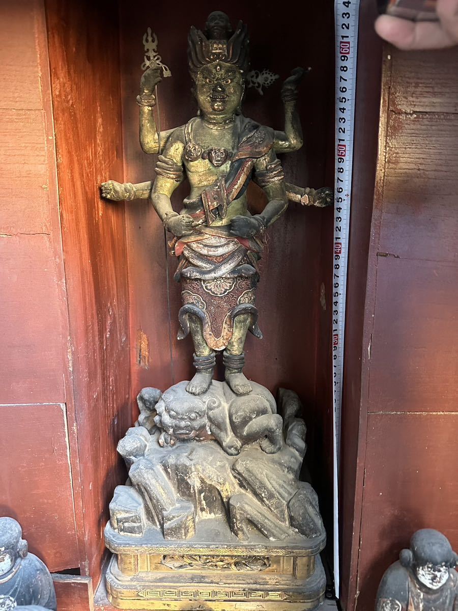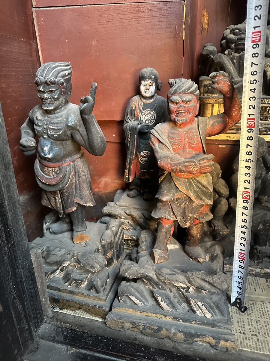 Such altar groupings were installed in regional temples or subsidiary halls, where they functioned as fixed devotional installations. They were not designed for frequent movement, and deterioration over time is common when removed from architectural context.