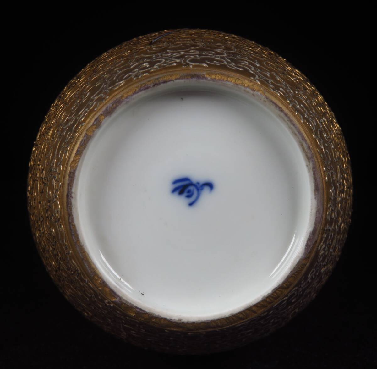 Blue enamel elements are layered cleanly atop the gold field, indicating disciplined firing and enamel separation.