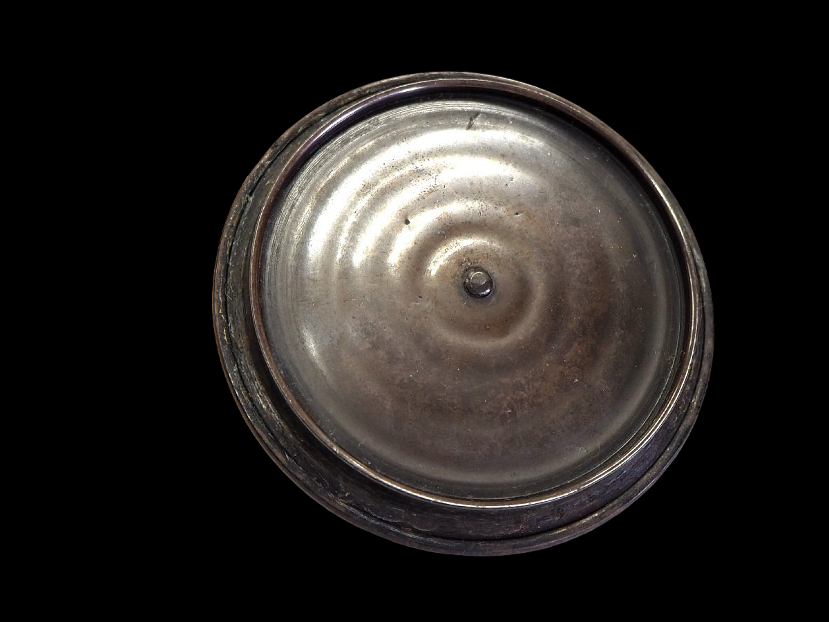 The copper lid is an important functional and aesthetic component, offering a warmer contrast against the iron body and reinforcing the object’s status as a complete tea implement rather than a decorative fragment. The presence of a fitted wooden box supports careful keeping and suggests the kettle circulated as a preserved utensil.