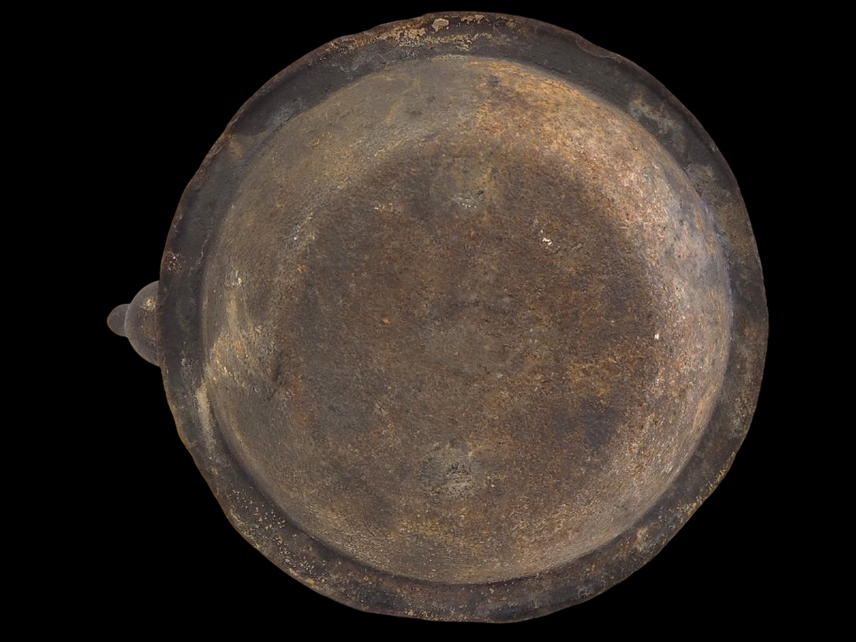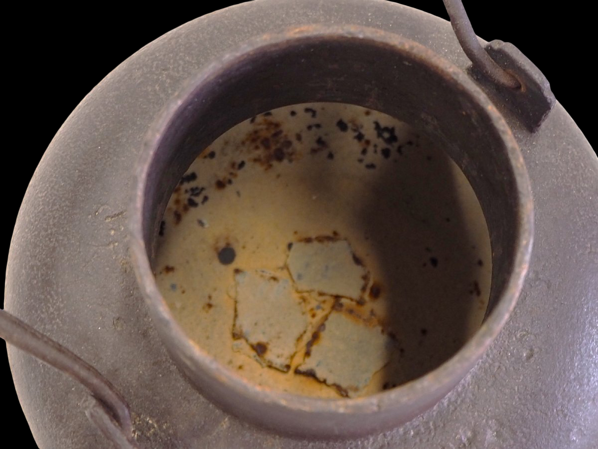 The accompanying description indicates that the kettle has been tested for leakage. Because interior condition, lining status, and the full extent of pitting cannot be verified from photographs alone, this piece should be approached conservatively as a collectible ironware object that may require customary care before practical use.