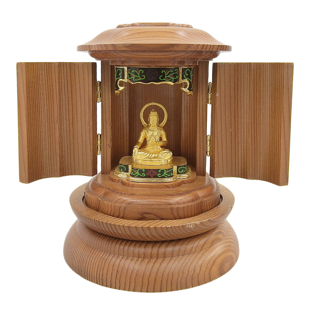 Encasing the figure is a zushi—a portable or household shrine traditionally crafted from wood and designed to protect sacred images when not in use. The presence of the zushi transforms the object from a standalone sculpture into a complete devotional system, reinforcing ritual privacy, respect, and controlled presentation. When opened, the shrine frames the Buddha as a focal point; when closed, it preserves sanctity and physical condition.