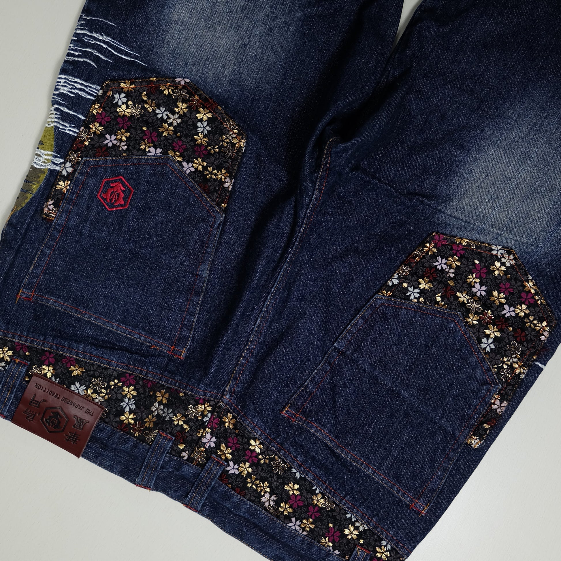 Kaccho Fugetsu “Japanese Tradition” Embroidered Geisha & Moon Wagara Denim Shorts – Size 36