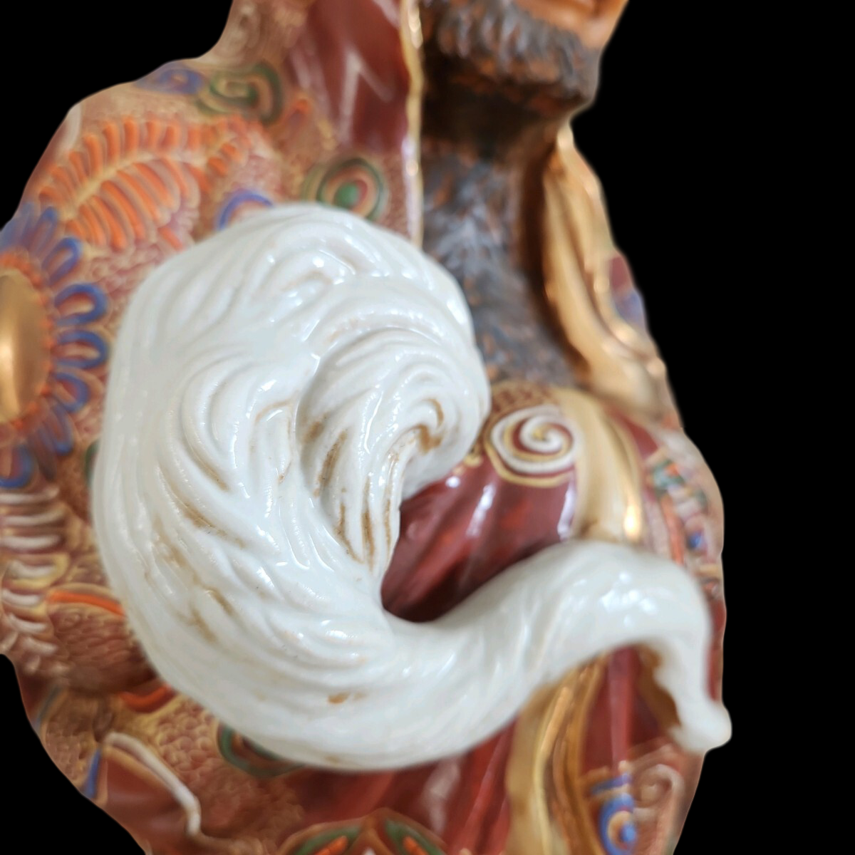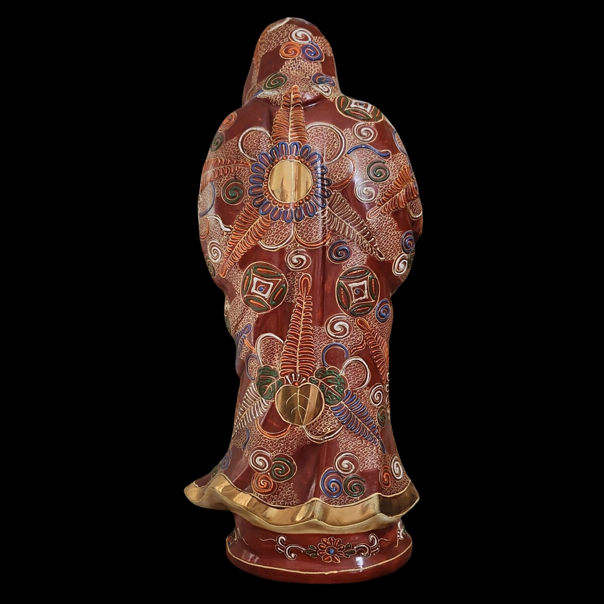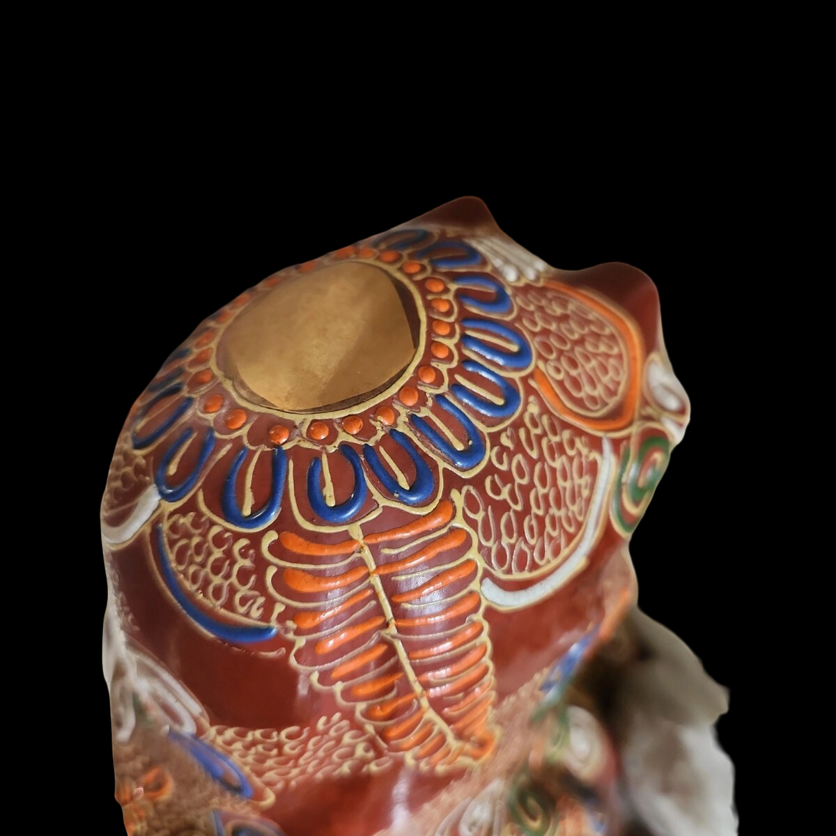 Why Kutani? Kutani ware is prized for saturated color, confident linework, and decorative density. Here, the robe is treated as a canvas: repeating motifs, layered pattern bands, and gilded accents that reward close looking from every angle.