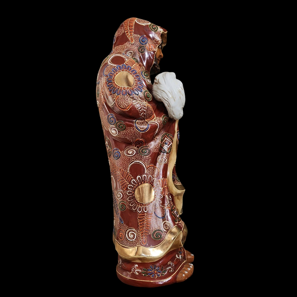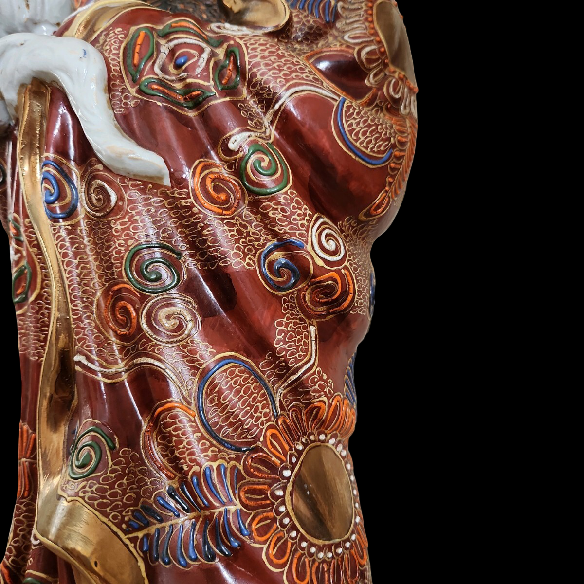 This statement-scale Kutani ceramic figure depicts Daruma Daishi (Bodhidharma), rendered with vivid overglaze decoration and textile-like patterning that reads like brocade translated into porcelain. At nearly half a meter tall, it moves beyond “shelf figurine” into room-setting interior sculpture—an object with presence.